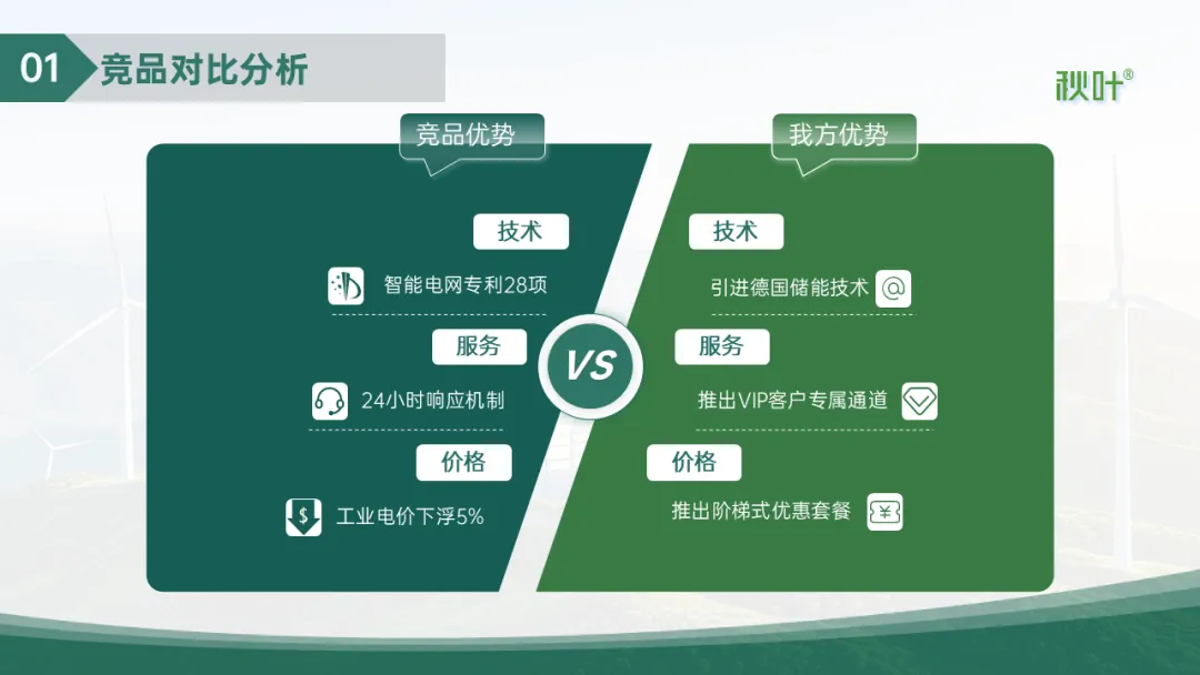 竞品优势VS我方优势,用左右斜分作对比,中间加个对比符号,谁好谁坏一目了然。