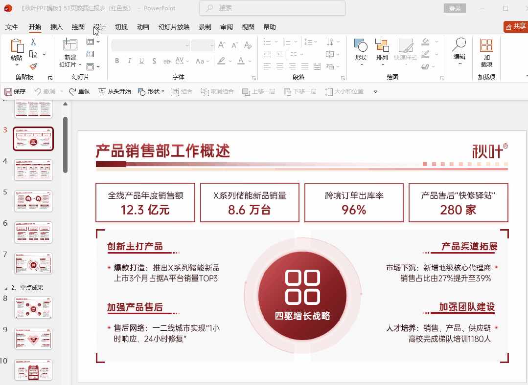 秋叶 PPT 的导师带领学员们按照【工作概述】【重点成果】【项目复盘】【不足改进】【未来计划】【数据面板】6 大模块,足足制作了51 页精美的逻辑图 PPT。