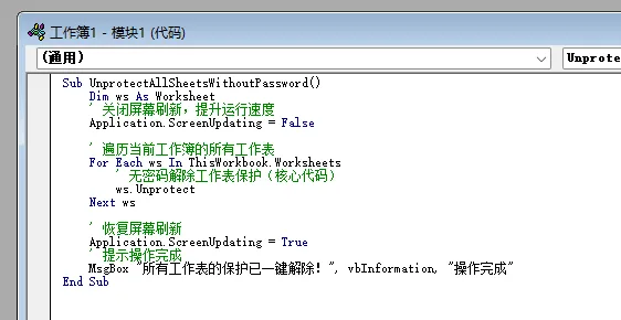 Sub UnprotectAllSheetsWithoutPassword() Dimws As Worksheet ' 关闭屏幕刷新,提升运行速度 Application.ScreenUpdating = False ' 遍历当前工作簿的所有工作表 For Each ws In ThisWorkbook.Worksheets ' 无密码解除工作表保护(核心代码) ws.Unprotect Next ws ' 恢复屏幕刷新 Application.ScreenUpdating = True ' 提示操作完成 MsgBox "所有工作表的保护已一键解除!", vbInformation, "操作完成"End Sub