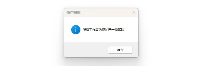 5.稍等片刻,会弹出 “所有工作表的保护已一键解除!” 的提示框,点击 “确定” 即可。