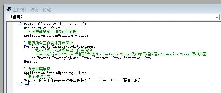 Sub ProtectAllSheetsWithoutPassword() Dim ws As Worksheet ' 关闭屏幕刷新,加快运行速度 Application.ScreenUpdating = False ' 遍历所有工作表并开启保护 For Each ws In ThisWorkbook.Worksheets ' 核心代码:无密码开启工作表保护 ' DrawingObjects:=True 保护形状/图表,Contents:=True 保护单元格内容,Scenarios:=True 保护方案 ws.Protect DrawingObjects:=True, Contents:=True, Scenarios:=True Next ws ' 恢复屏幕刷新 Application.ScreenUpdating = True ' 提示操作完成 MsgBox "所有工作表已一键开启保护!", vbInformation, "操作完成"End Sub