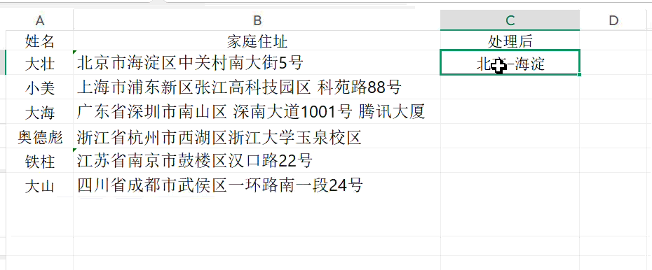 例如在一长串详细地址中提取出省、市信息,我们可以使用快捷键“Ctrl+E”一键提取,注意要先在第一行输入内容信息,再进行快捷操作哦!