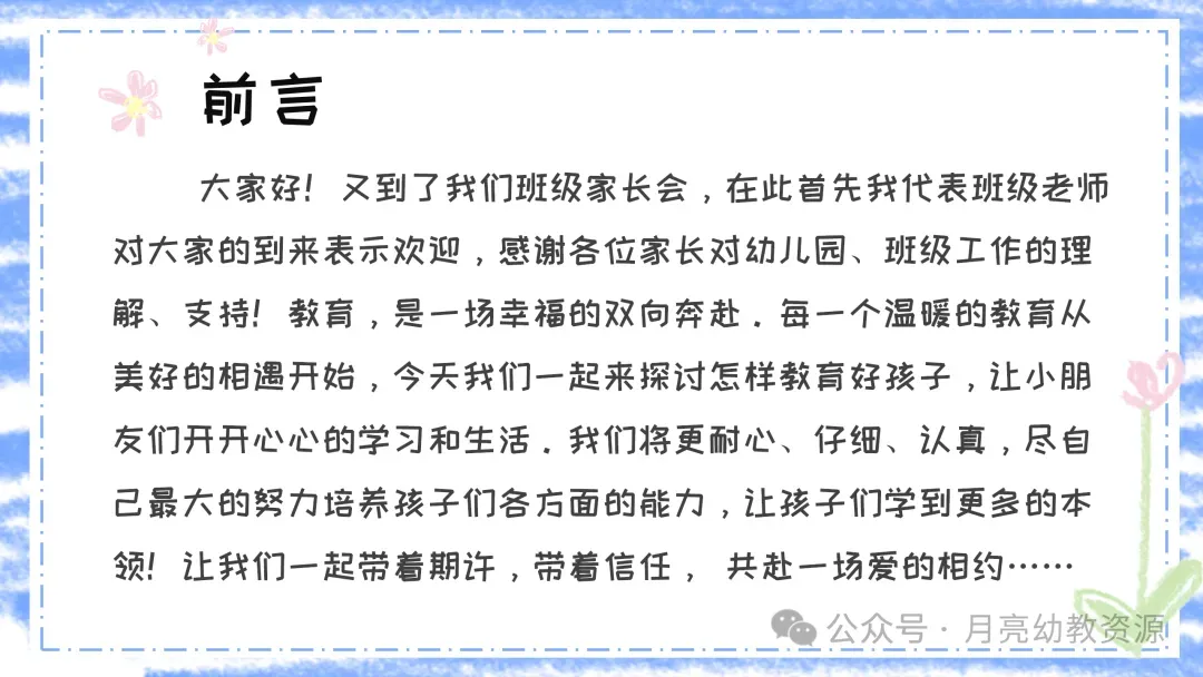大家好!又到了我们班级家长会,在此首先我代表班级老师对大家的到来表示欢迎,感谢各位家长对幼儿园、班级工作的理解、支持!教育,是一场幸福的双向奔赴。每一个温暖的教育从美好的相遇开始,今天我们一起来探讨怎样教育好孩子,让小朋友们开开心心的学习和生活。我们将更耐心、仔细、认真,尽自己最大的努力培养孩子们各方面的能力,让孩子们学到更多的本领!让我们一起带着期许,带着信任, 共赴一场爱的相约……