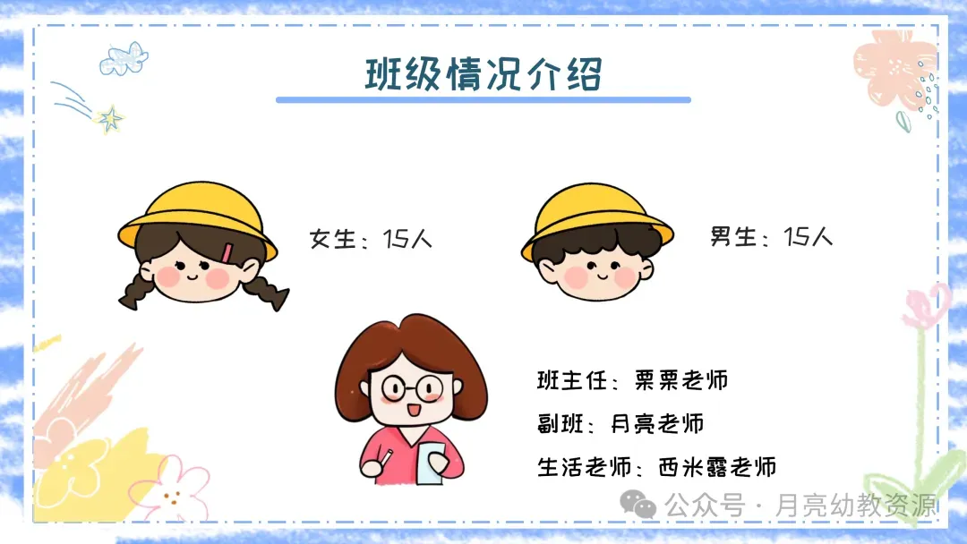 孩子们的成长总是在不经意间,很有幸陪伴孩子们走过了这么长时间,也很欣慰孩子们经过上学期的学习,都在自己原有的水平上取得了一定的进步,下面让我们来了解一下我们的班级现状分析,我们班现在是30人,男生15,女生15,这学期还是由我和黄老师、邱老师带领小朋友一起学期。