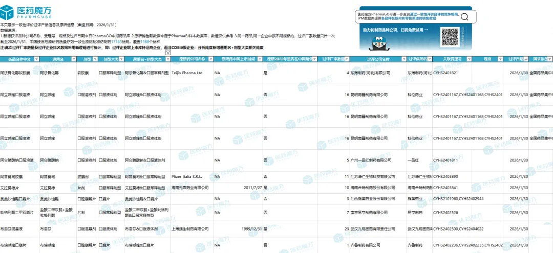 医药魔方《一致性过评清单》最新出炉!(数据截止于2026.1.31),如需本清单Excel,可点击下方小程序下载。