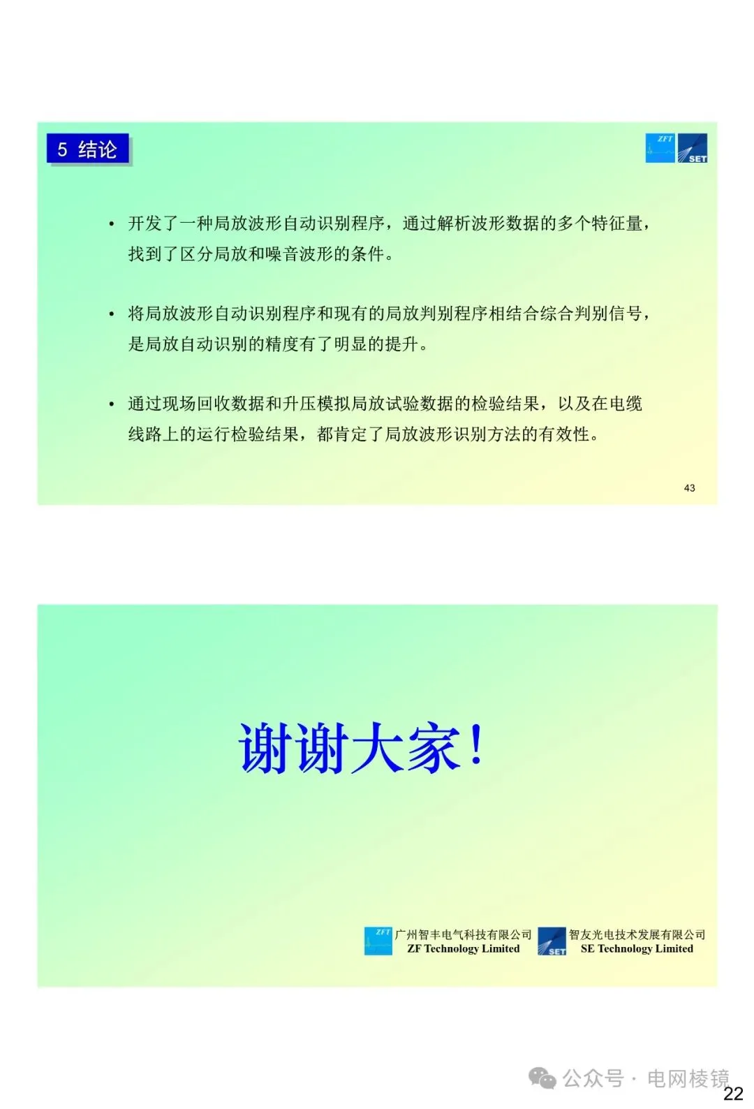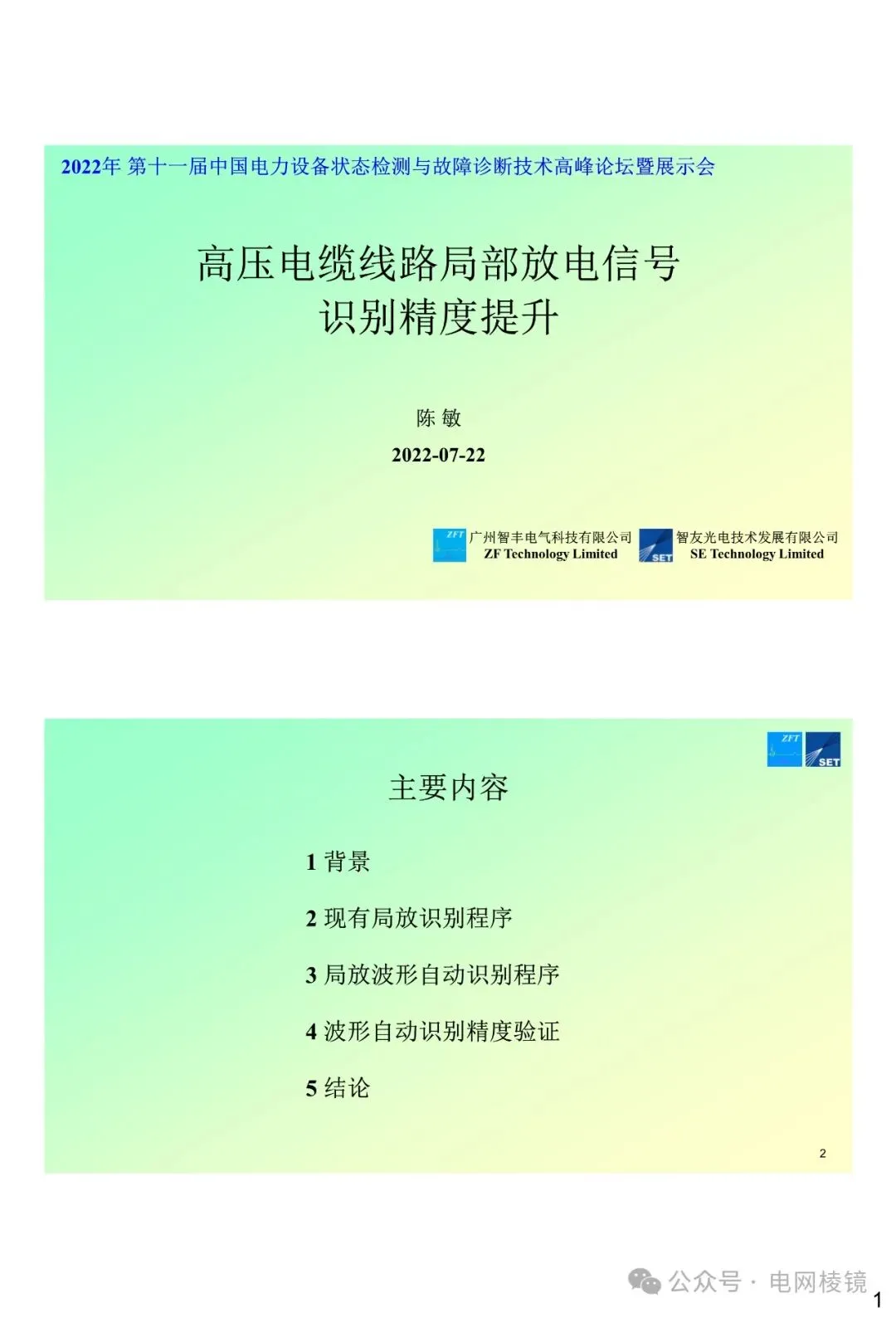 PPT为2022年11月22日第十一届中国电力设备状态检测与故障诊断技术高峰论坛暨展示会上,智友光电技术发展有限公司、SE Technology Limited、广州智丰电气科技有限公司和ZF Technology Limited四家公司联合发表的关于高压电缆线路局部放电信号识别精度提升的技术报告。