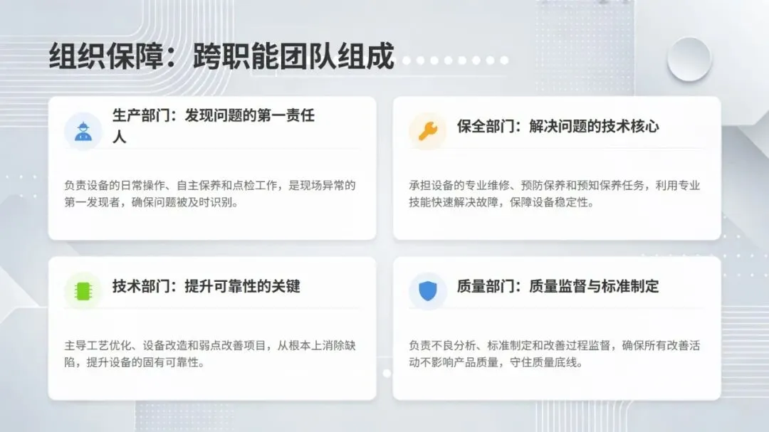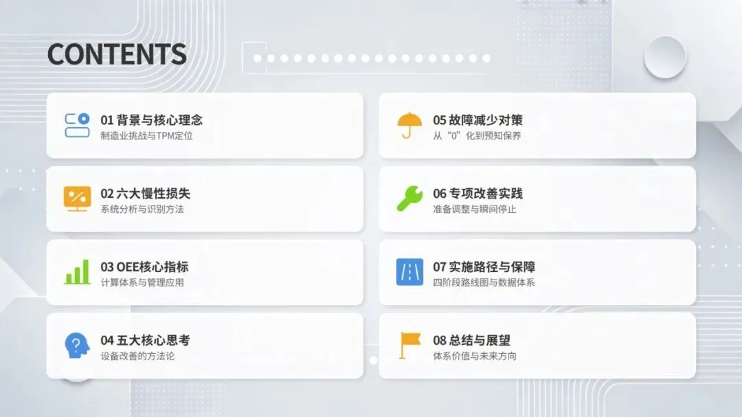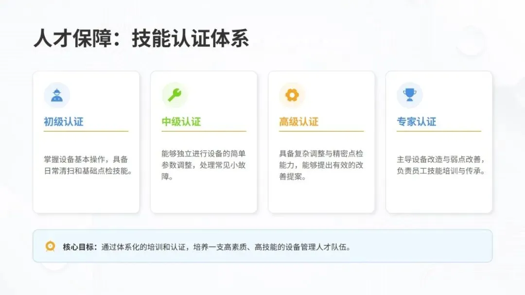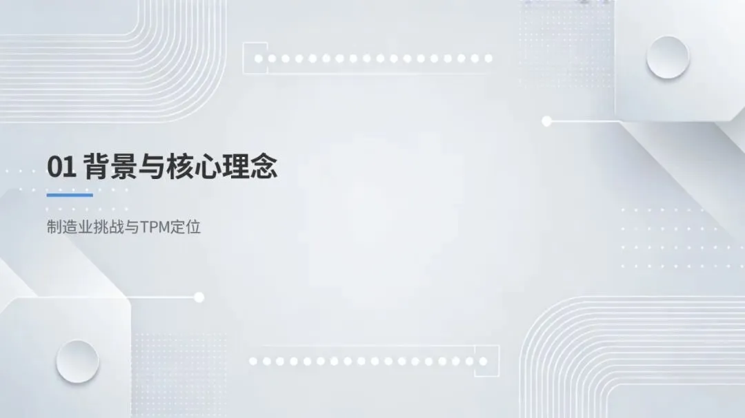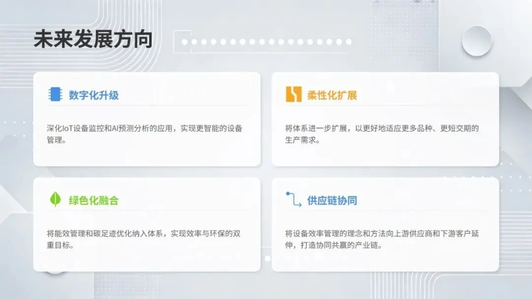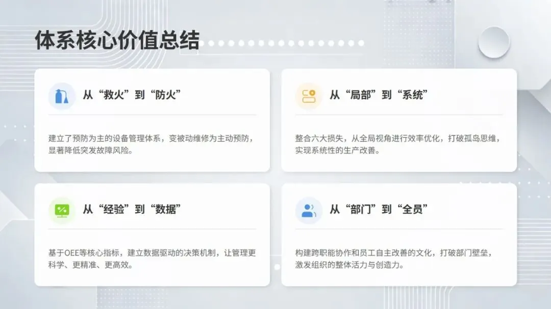 同时,体系强调数据驱动与跨职能协作,构建从设备层到工厂层的全层级数据采集与报表体系,搭配组织保障与技能认证机制,形成 “预防为主、全员参与、持续优化” 的管理闭环。该体系不仅有效解决设备自动化背景下的效率损失问题,更推动企业从局部改善走向系统优化,为数字化、绿色化、供应链协同的未来发展奠定坚实基础。