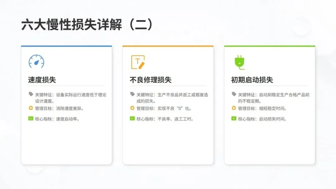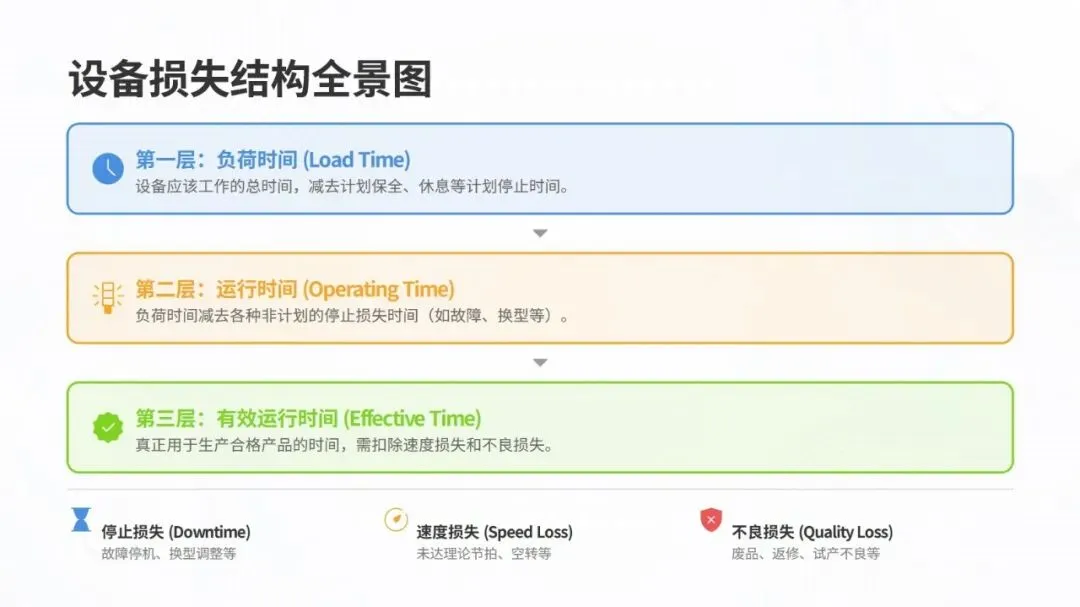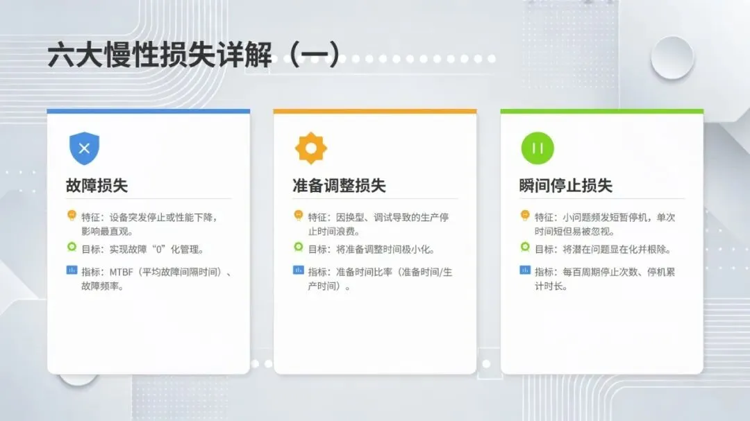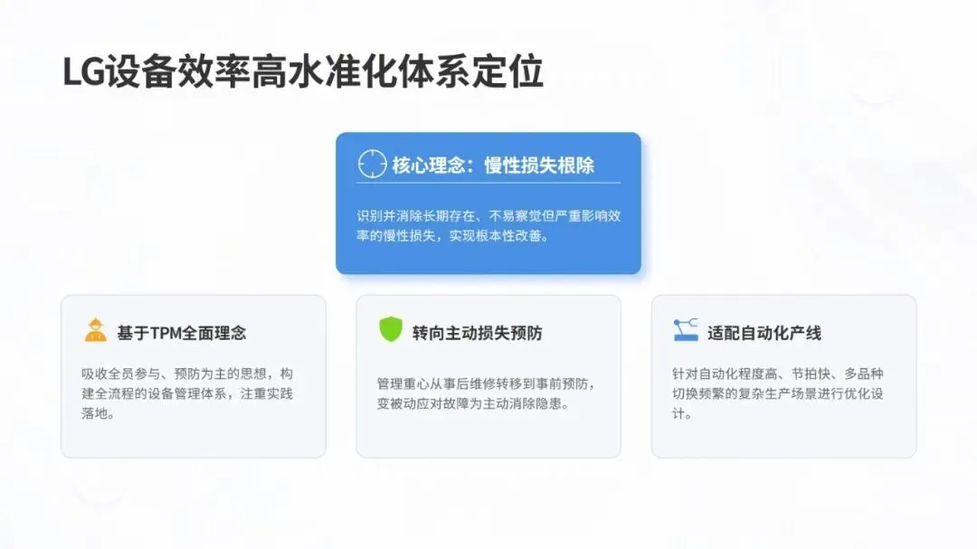 LG 设备效率高水准化体系以 TPM 理念为核心,聚焦制造业多品种小批量、短交期的主流场景,旨在实现从 “故障应对” 到 “损失预防与消除” 的转型。体系核心围绕六大慢性损失(故障、准备调整、瞬间停止等)展开系统分析,通过设备综合效率(OEE)指标体系量化管理,该指标由时间启动率、性能启动率、良品率相乘得出,是衡量设备效率的核心标尺,行业数据显示其世界级水平需达 85% 以上。