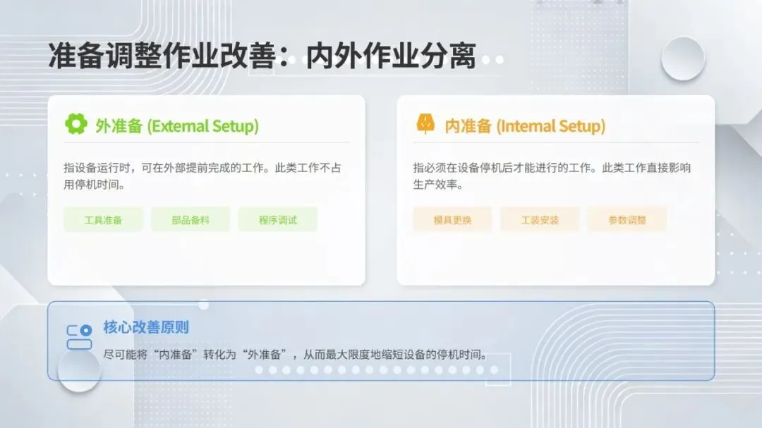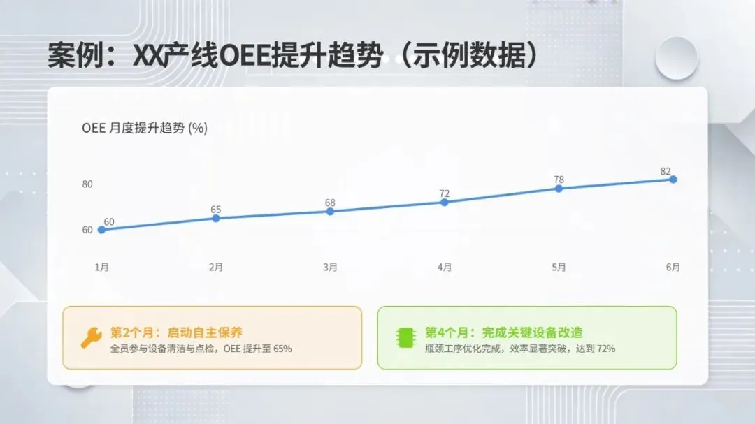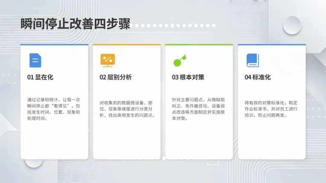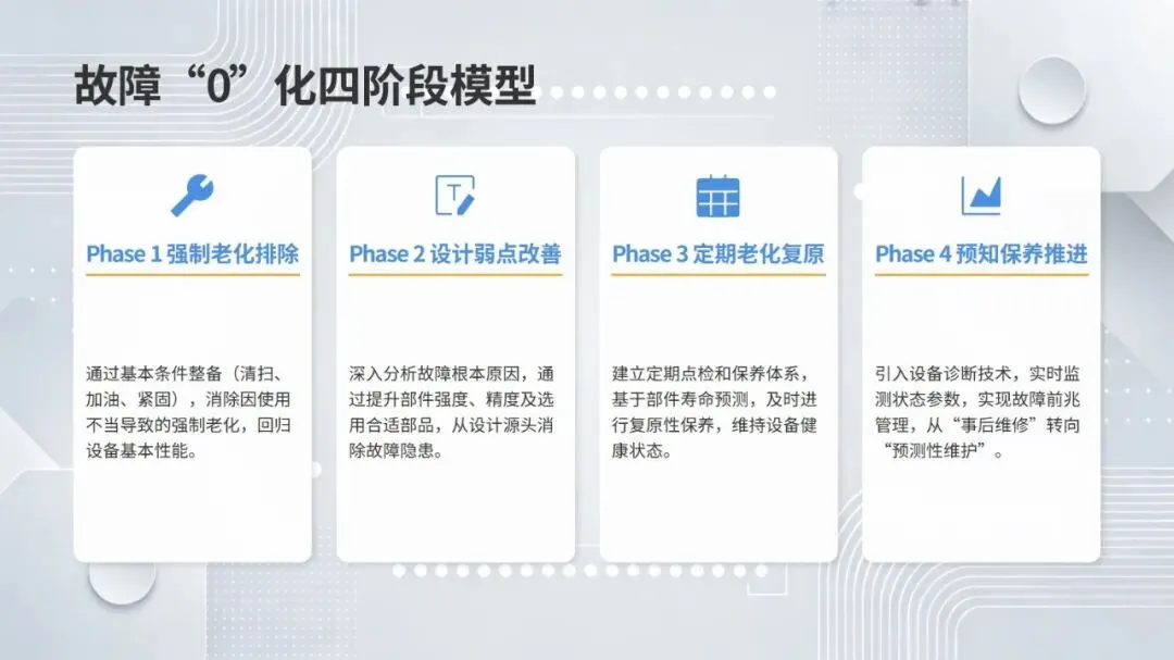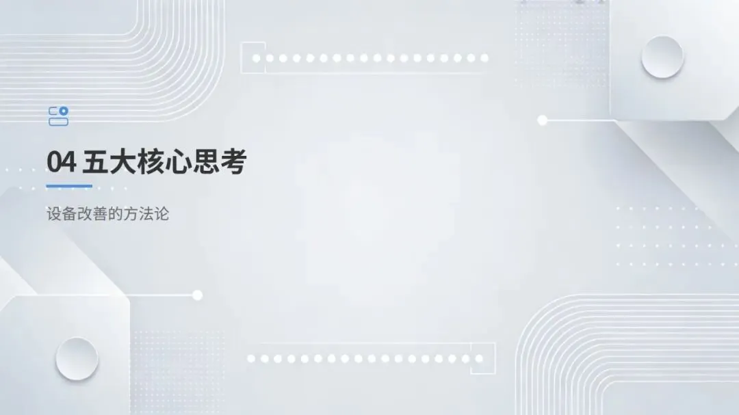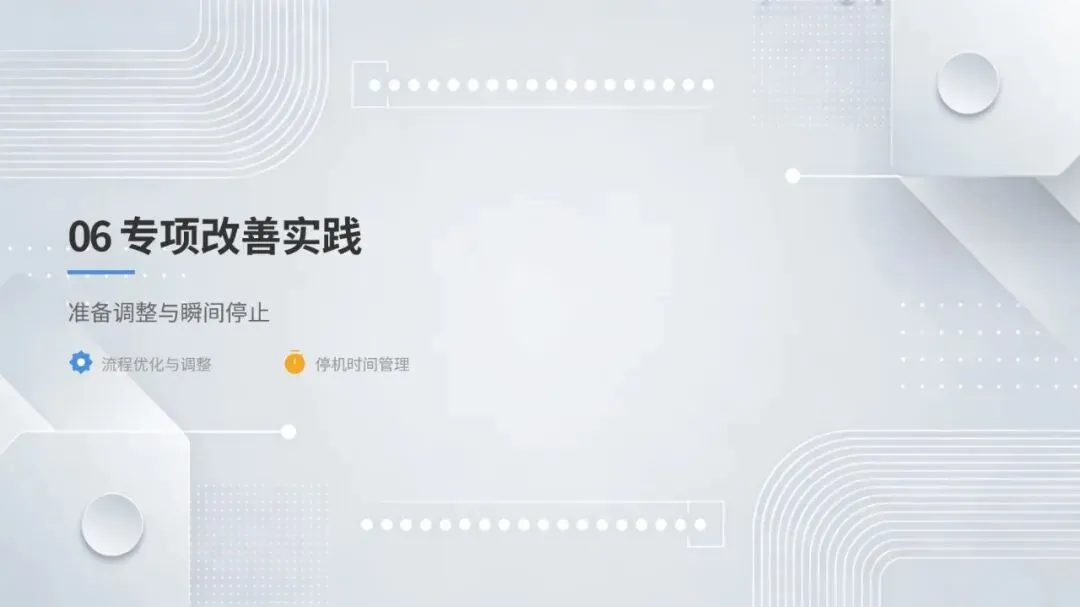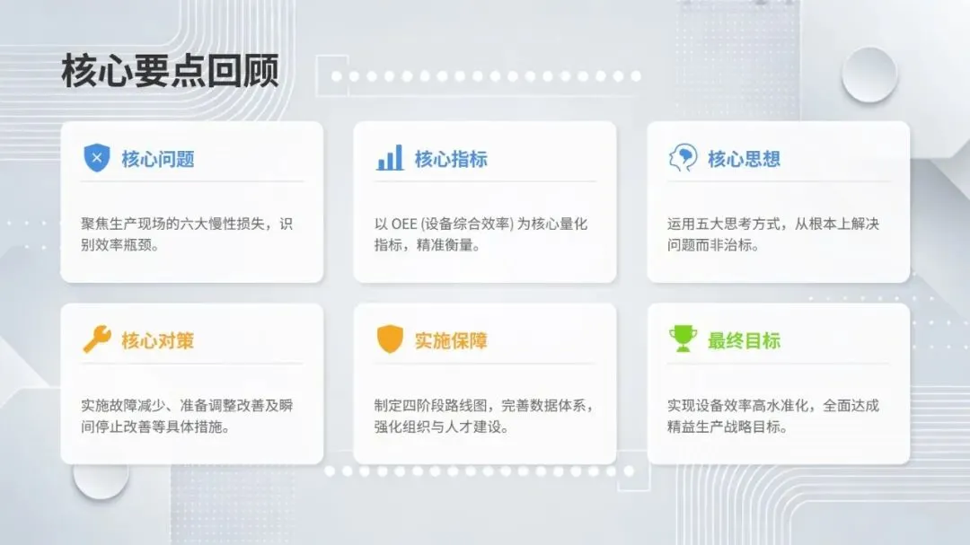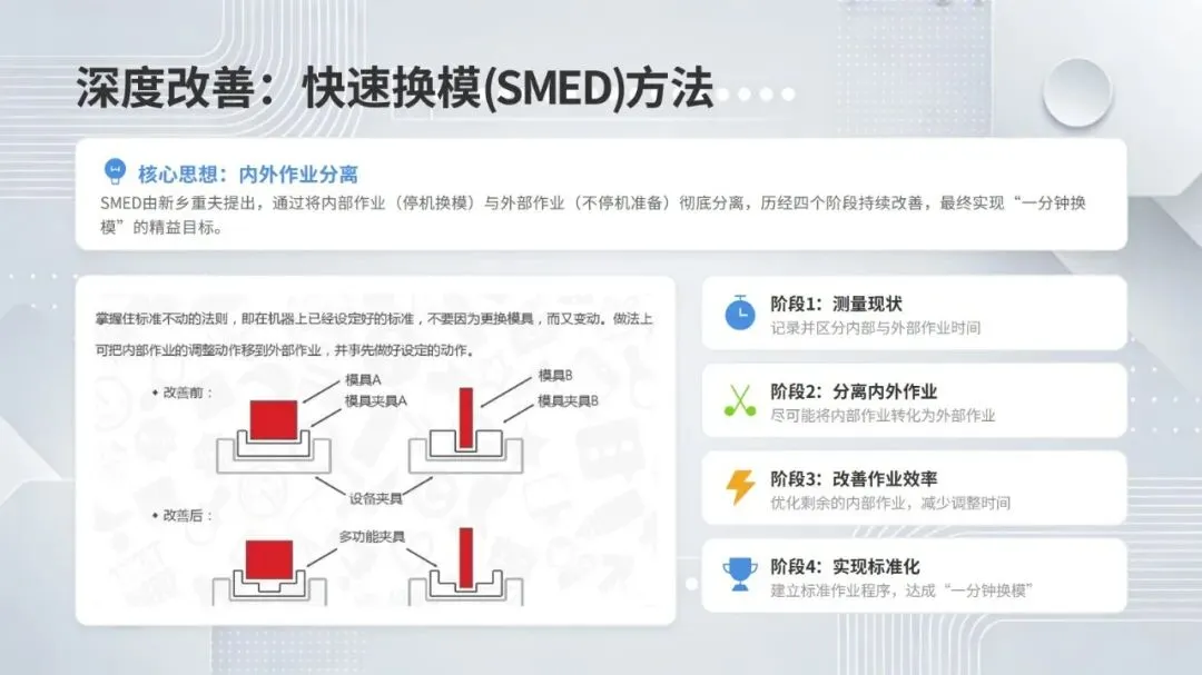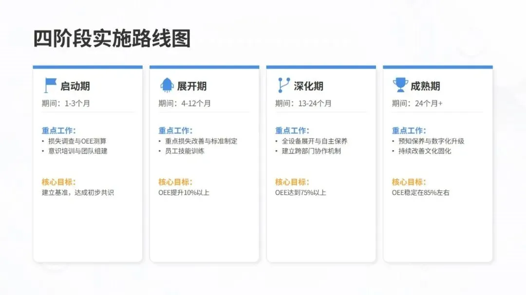 体系构建了五大核心改善思考方式,包括复原老化设备、追求理想状态、层级管理缺陷、推动调整转调节、体系化提升技能,并针对性给出故障减少四阶段模型、准备调整内外作业分离、瞬间停止显在化改善等具体对策。实施层面采用四阶段路线图,通过启动期基准建立、展开期重点改善、深化期全面推广、成熟期文化固化,逐步实现 OEE 稳步提升。
