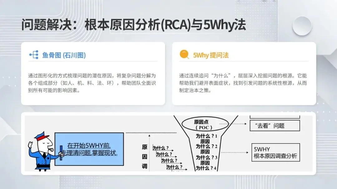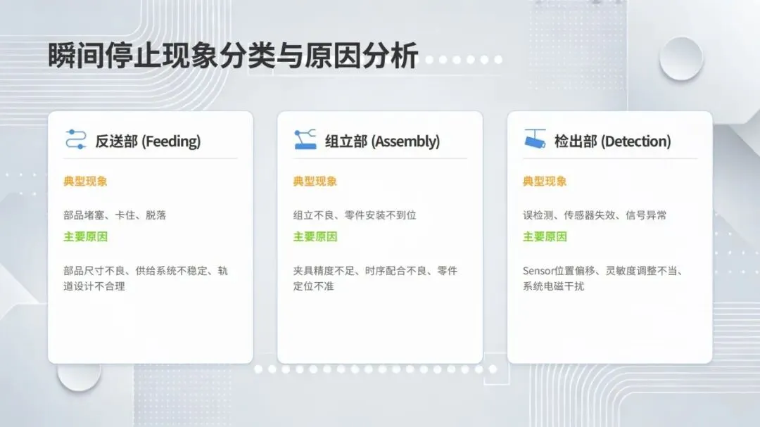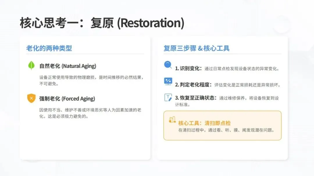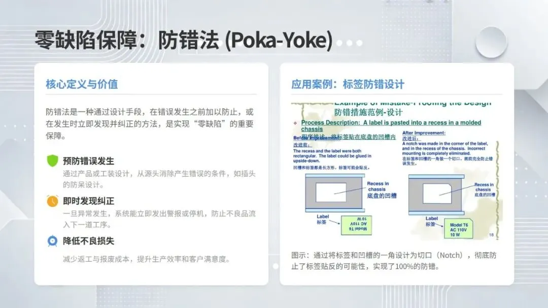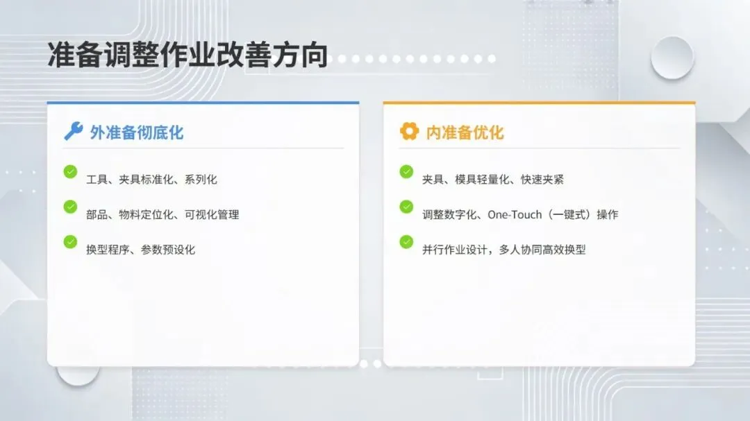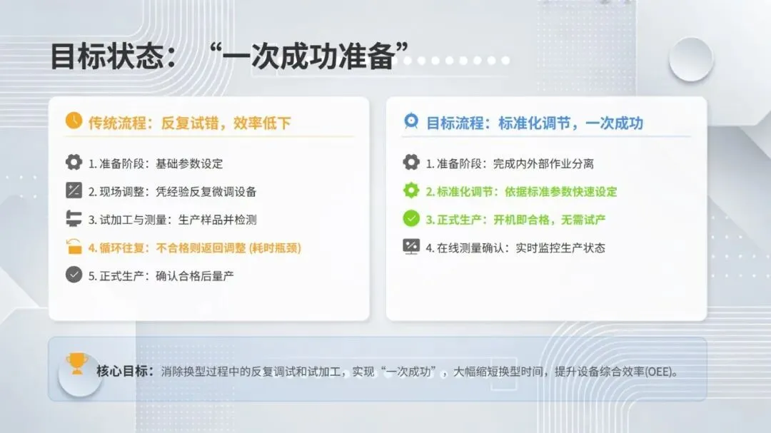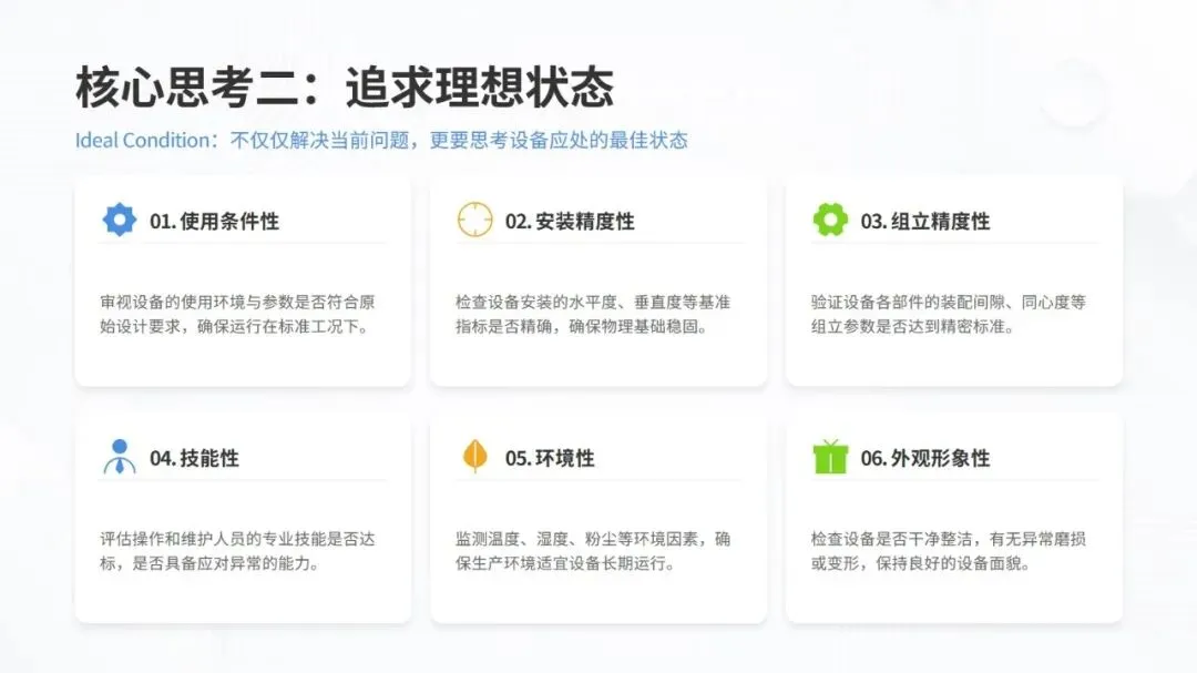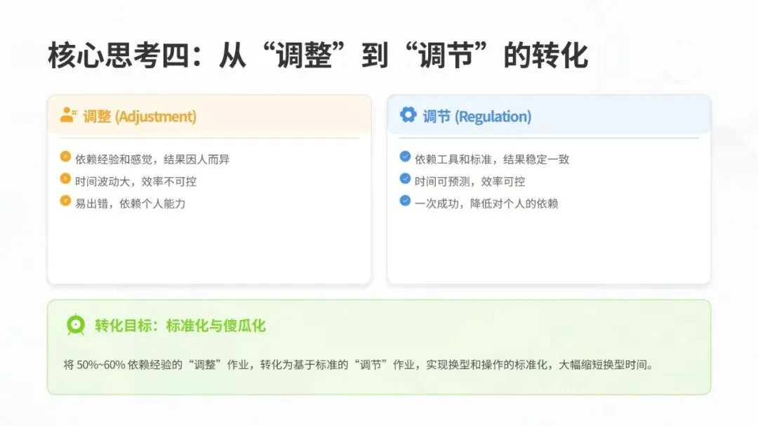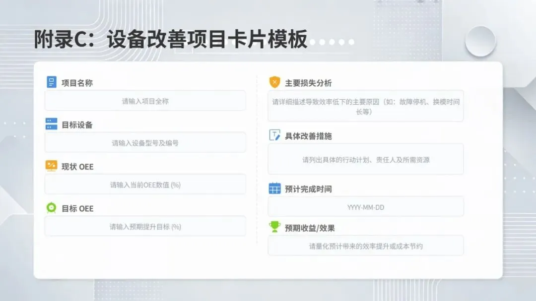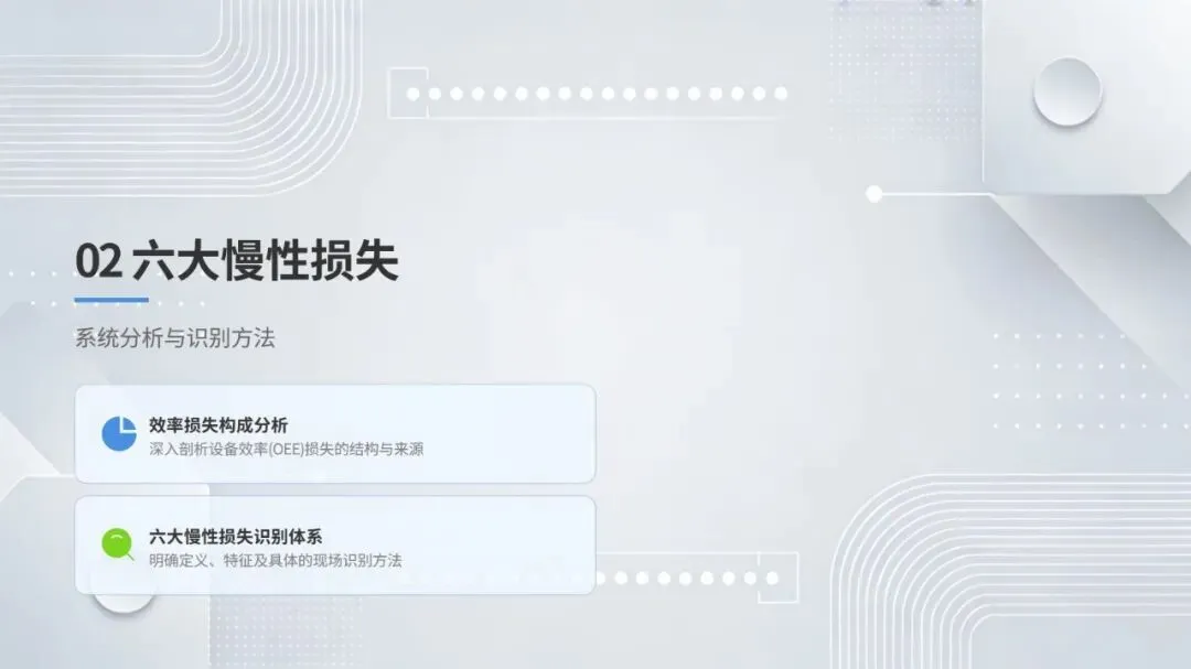 体系构建了五大核心改善思考方式,包括复原老化设备、追求理想状态、层级管理缺陷、推动调整转调节、体系化提升技能,并针对性给出故障减少四阶段模型、准备调整内外作业分离、瞬间停止显在化改善等具体对策。实施层面采用四阶段路线图,通过启动期基准建立、展开期重点改善、深化期全面推广、成熟期文化固化,逐步实现 OEE 稳步提升。