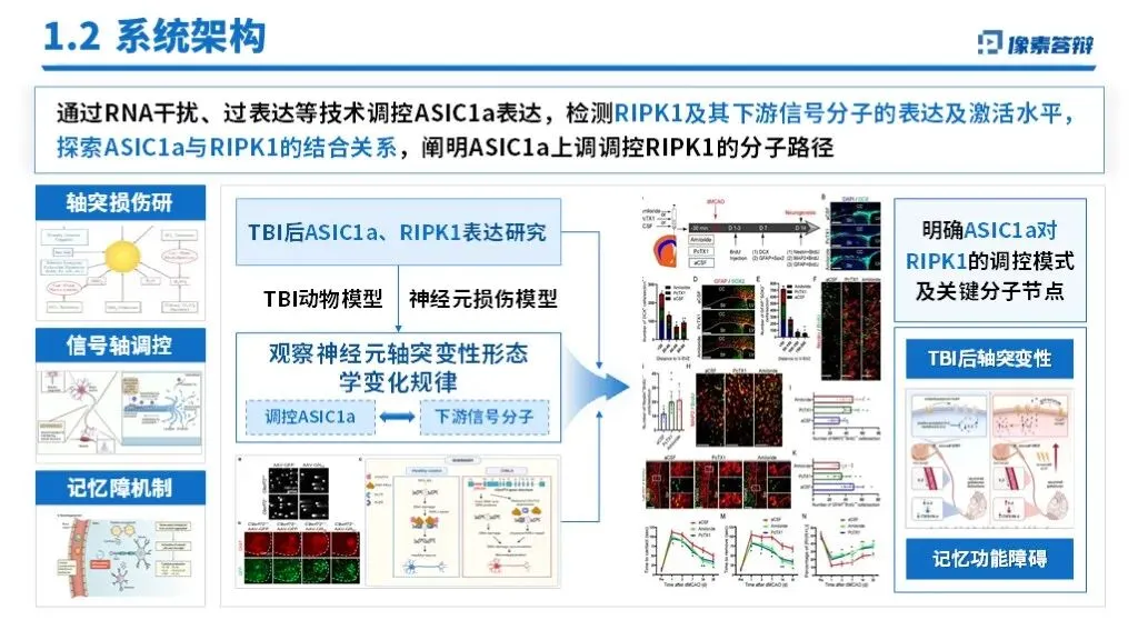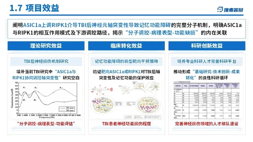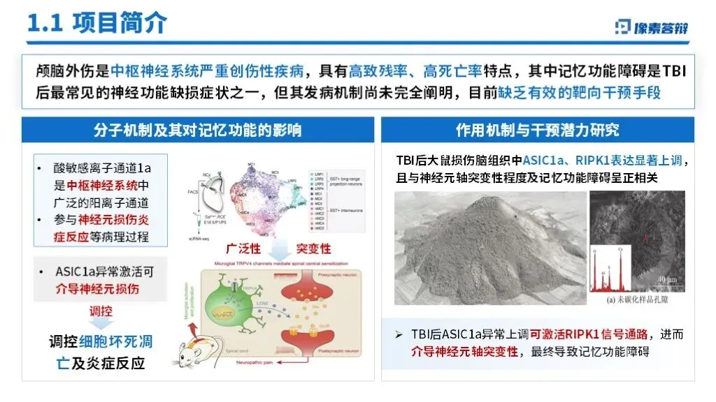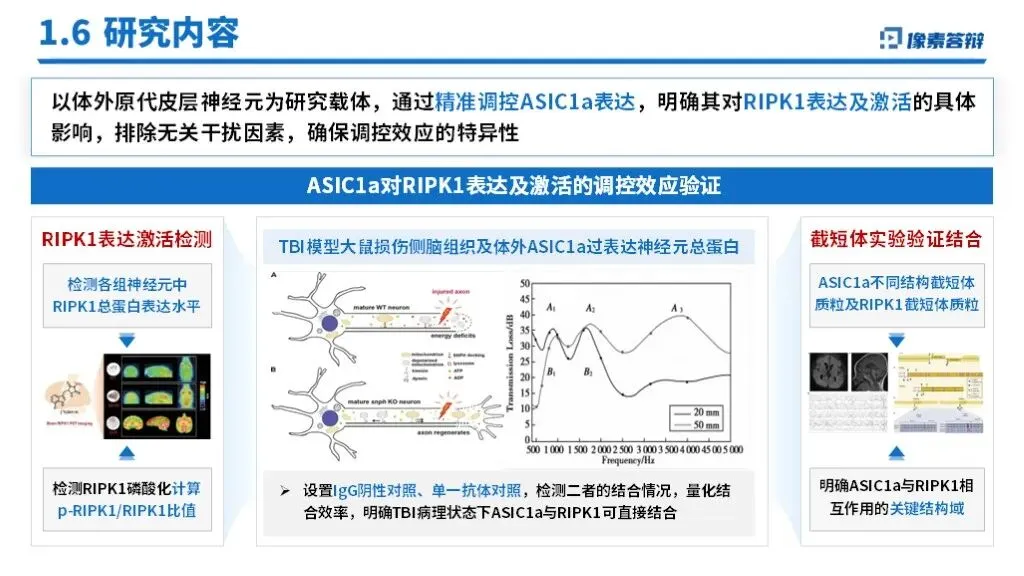 PPT 开篇聚焦颅脑外伤(TBI)后记忆功能障碍这一高致残率临床难题,指出其发病机制不明、缺乏有效干预手段的痛点,提出 “ASIC1a 上调 RIPK1 介导 TBI 后神经元轴突变性导致记忆障碍” 的核心科学假说,为研究锚定清晰目标。