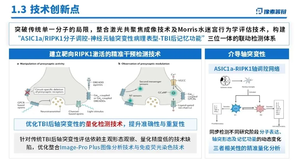 突破传统单一分子研究局限,整合激光共聚焦成像与行为学评估技术,构建 “分子调控 - 病理表型 - 功能缺损” 三位一体联动检测体系;建立靶向 RIPK1 激活的精准干预技术,优化轴突变性量化分析方法,显著提升检测准确性与重复性。