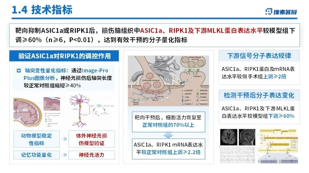 明确靶向抑制 ASIC1a 或 RIPK1 后,损伤组织中相关蛋白表达下调≥60% 的分子干预指标;通过 Image-Pro Plus 图像分析,验证轴突变长度较对照组缩短≥40% 的病理量化指标;同时设定动物模型稳定性、神经元活力等功能验证指标,确保成果可量化、可验证。