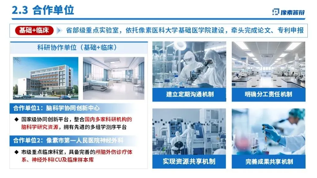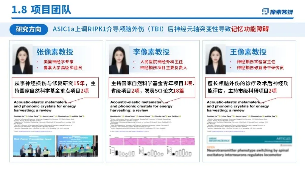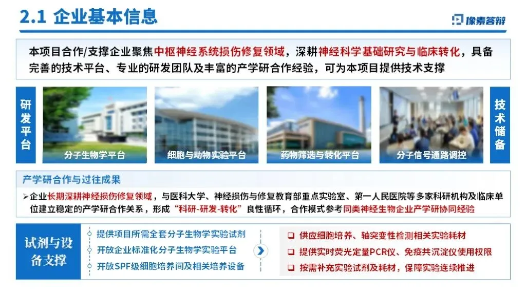 展示由神经科学专家领衔的高水平研究团队,其在神经损伤修复领域拥有 15 年研究经验及多项国家级项目主持经历;依托合作企业完善的分子生物学、药物筛选等技术平台,以及合法的实验动物使用资质,为项目的顺利开展提供坚实的人才与硬件支撑。