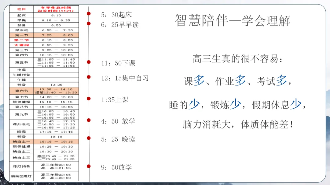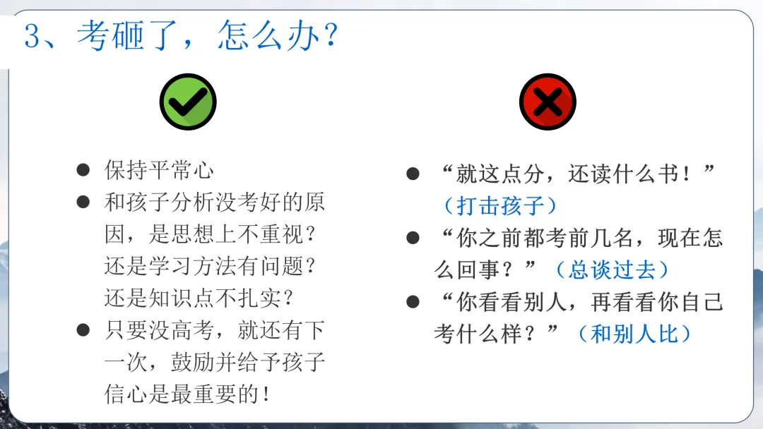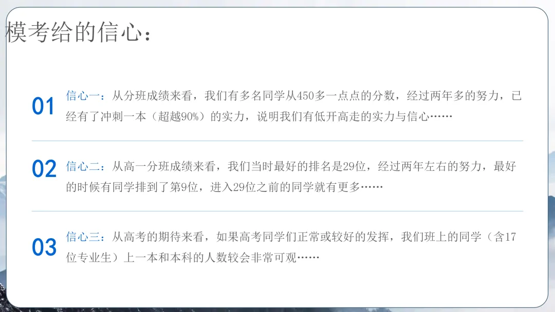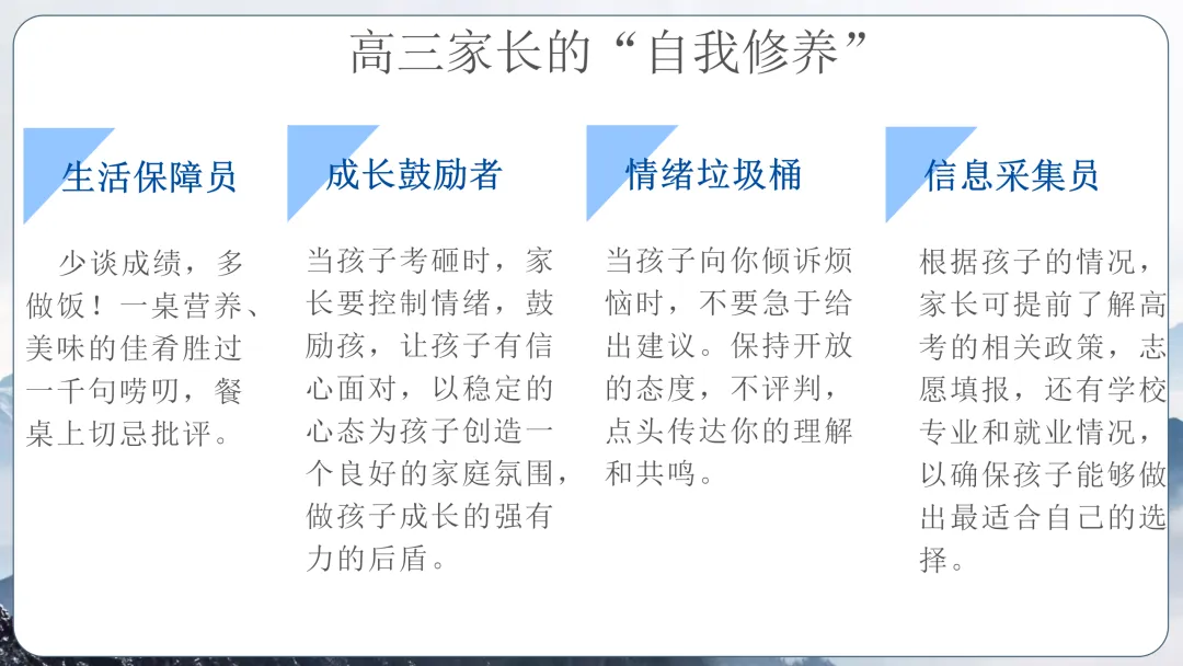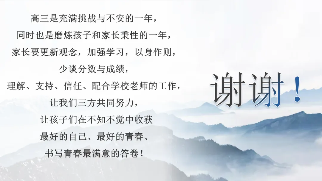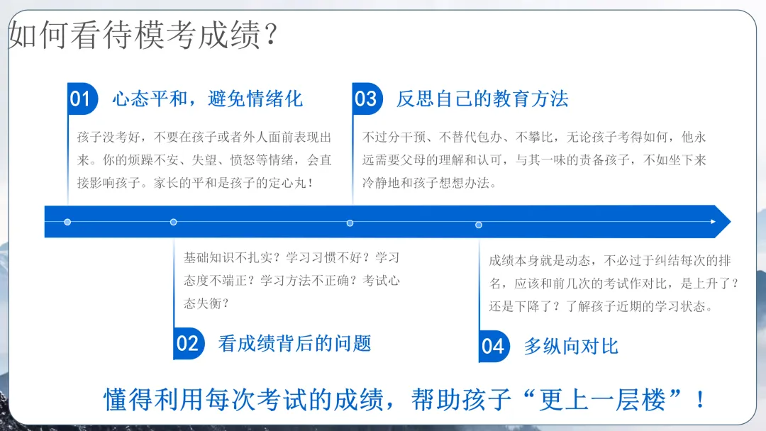 在接下来的时间里,我将从模考分析、升学节点、理解孩子和智慧陪伴这几个方面,和大家进行深入的交流和探讨。希望通过今天的家长会,能够让大家更加了解孩子们的学习状况,明确后续的努力方向,也能为大家在陪伴孩子备考的过程中,提供一些实用的建议和方法。