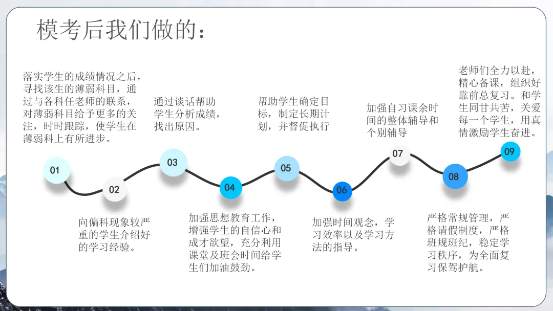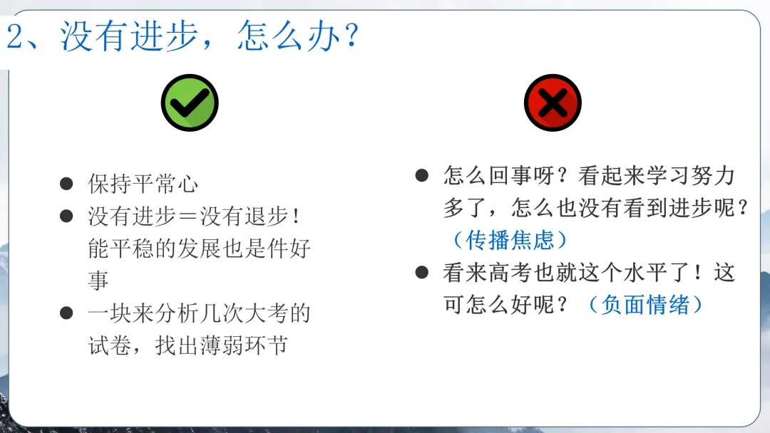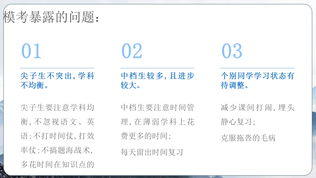 问题三:个别同学学习状态有待调整。在模考中,我们发现有个别同学的学习状态不太理想,可能存在学习动力不足、注意力不集中等问题。对于这部分同学,我们P9 如何看待模考成绩