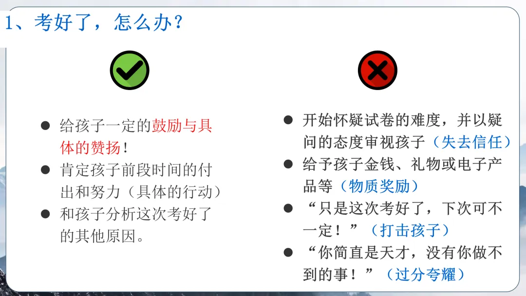 当孩子考好了,我们要给予他们适当的鼓励和赞扬,但也要注意方式方法。