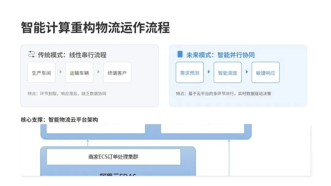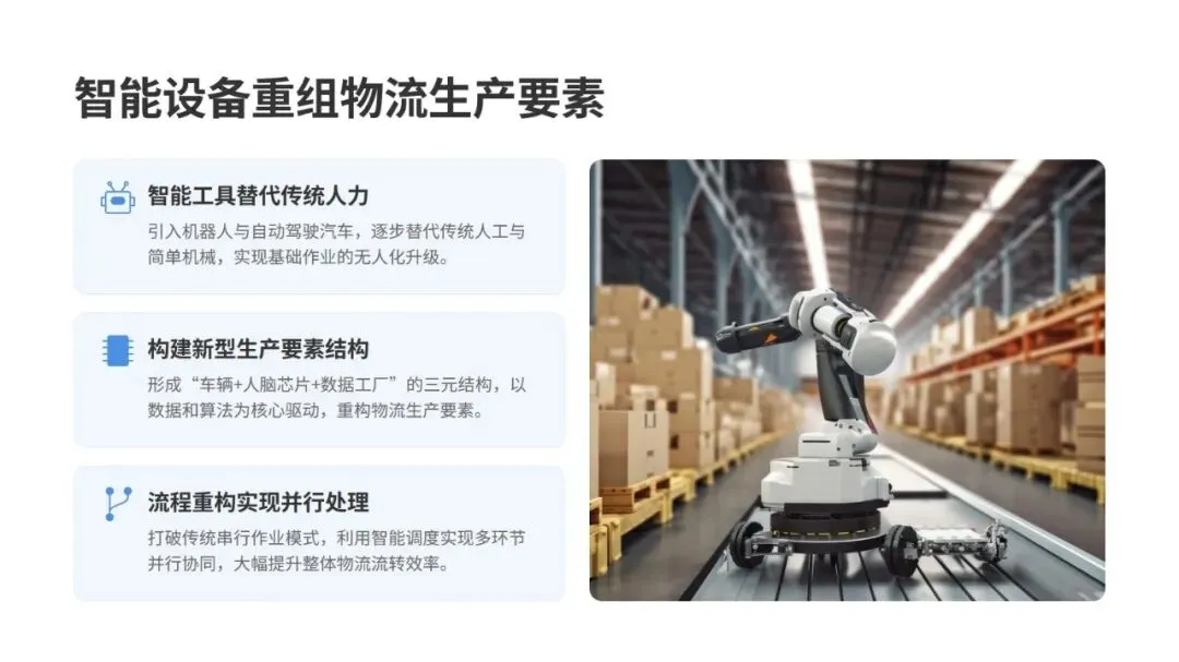 智能设备逐步替代传统人力与工具,重构物流生产要素结构;同时把传统串行的物流运作流程升级为多环节并行模式,依托智能物流云平台,实现供应链的数字化与一体化管理,推动行业从机械化、自动化阶段稳步迈向智慧物流新阶段。