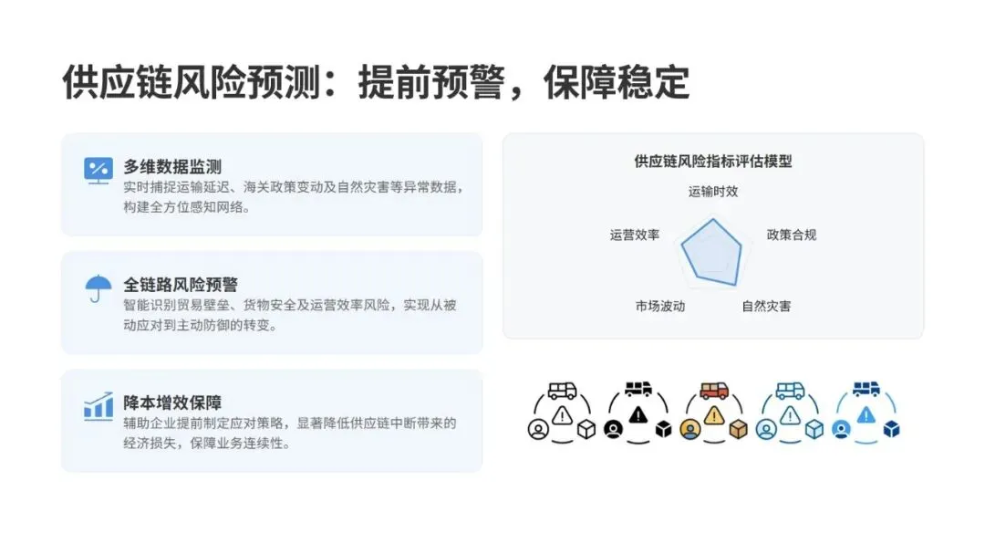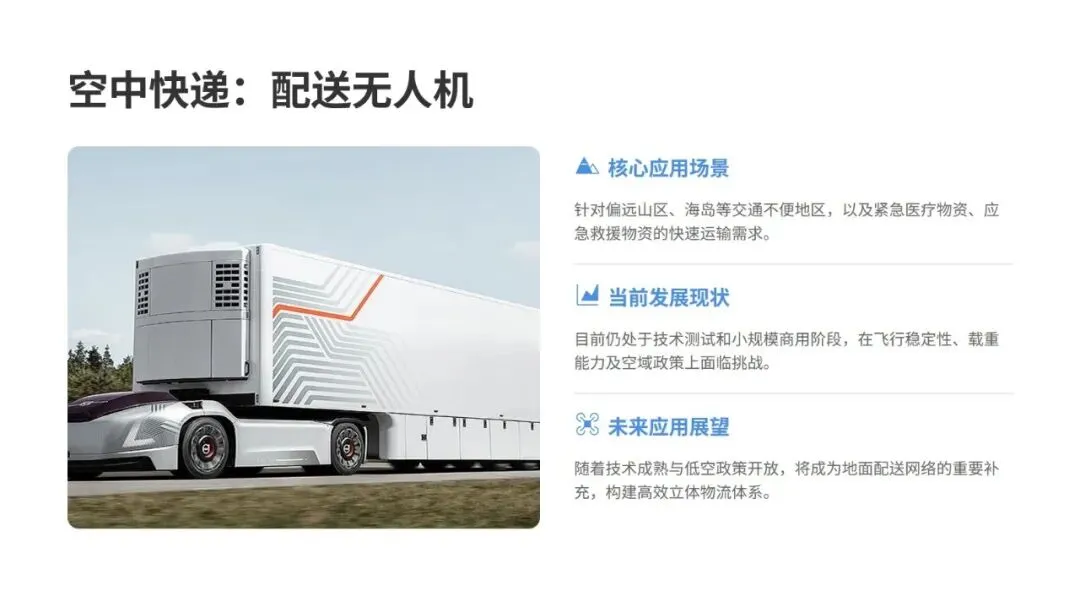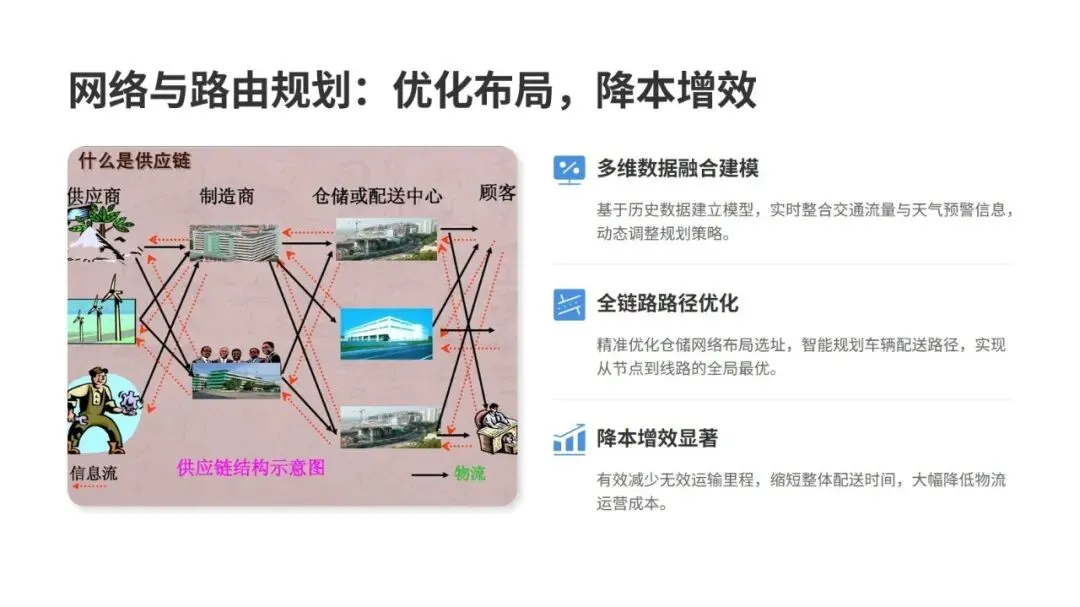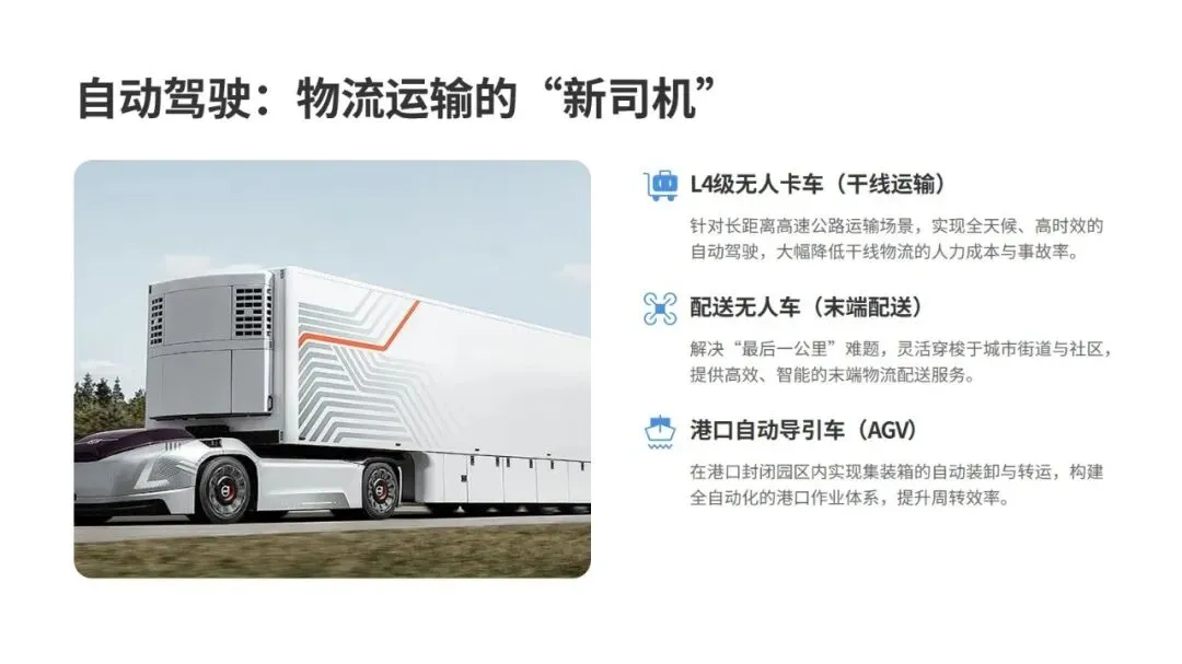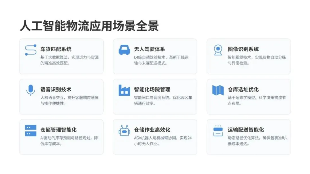 在具体应用层面,AI 深度渗透仓储、运输、配送、客服等关键环节,实现了智能仓储的高效调度、无人卡车的商业化试水,以及无人配送车与无人机的场景化测试,同时借助智能客服显著优化企业运营成本。此外,AI 还能赋能客户需求预测、设备维护预警、供应链风险防控以及网络路由规划等领域,帮助企业降本增效。