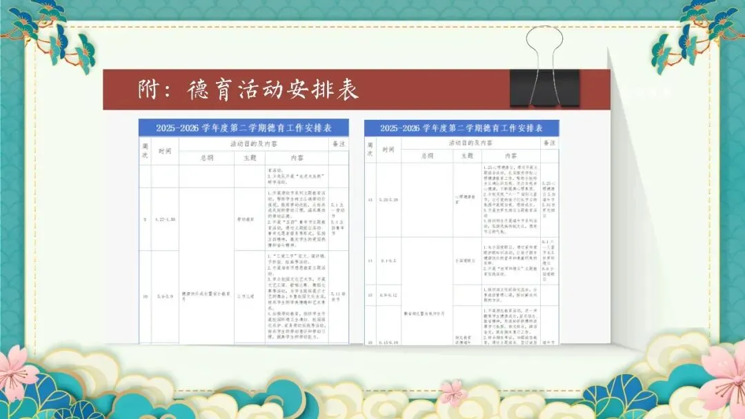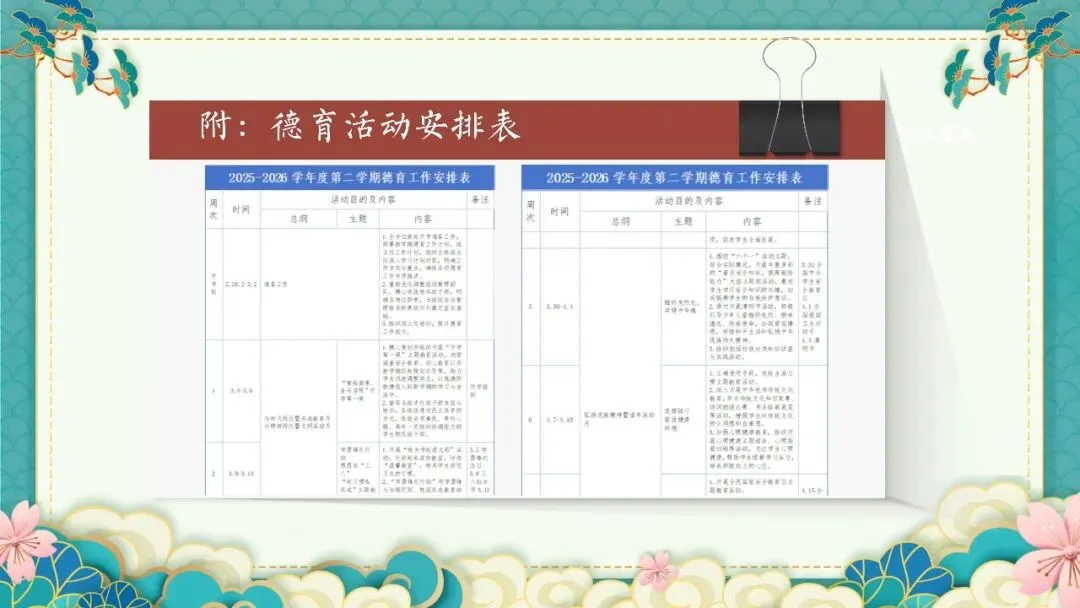 附上的德育活动安排表更是宝藏!从开学第一课、学雷锋活动,到传统文化竞赛、校园文化艺术节,每周都有精彩活动,孩子们的校园生活也太丰富了吧~