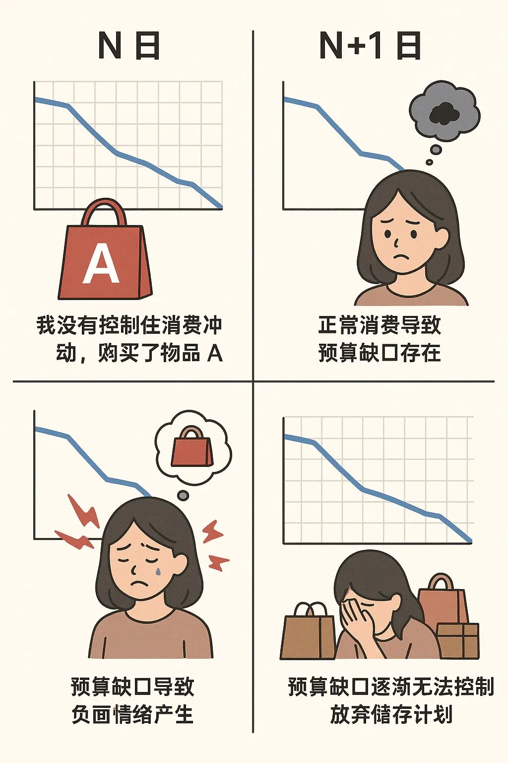 第 N 日,我没有控制住消费冲动,购买了物品 A,导致每日预算逐渐低于能够维持日常开销的值。第 N+1 日,哪怕是按照正常消费习惯,还是会导致预算缺口存在。预算缺口的存在会导致负面的情绪产生,进一步可能会发生通过购物满足来缓解负面情绪的想法。当预算缺口大到应该无法控制的值时,就逐渐的就开始放弃了存储计划。