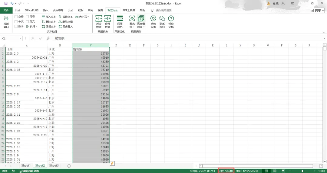打开Excel,看到50000行演示大数据(日期、区域、销售额、)