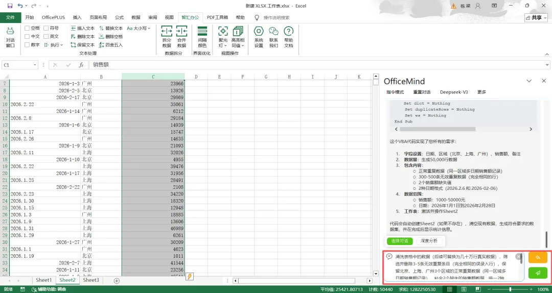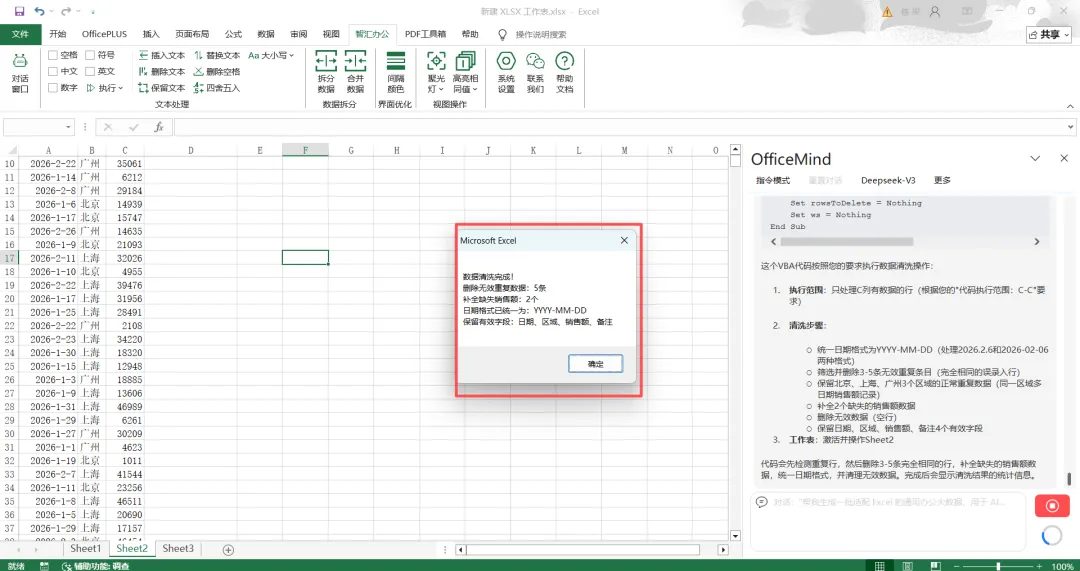 选中Excel中所有演示数据区域(若为几十万行数据,同样选中全部区域即可),打开OfficeMind插件,在指令框输入:“清洗表格中的数据(后续可替换为几十万行真实数据),筛选并删除3-5条无效重复条目(完全相同的误录入行),保留北京、上海、广州3个区域的正常重复数据(同一区域多日期销售额记录),补全2个缺失的销售额数据、统一2种日期格式为YYYY-MM-DD,删除无效数据,保留日期、区域、销售额、备注4个有效字段”。
