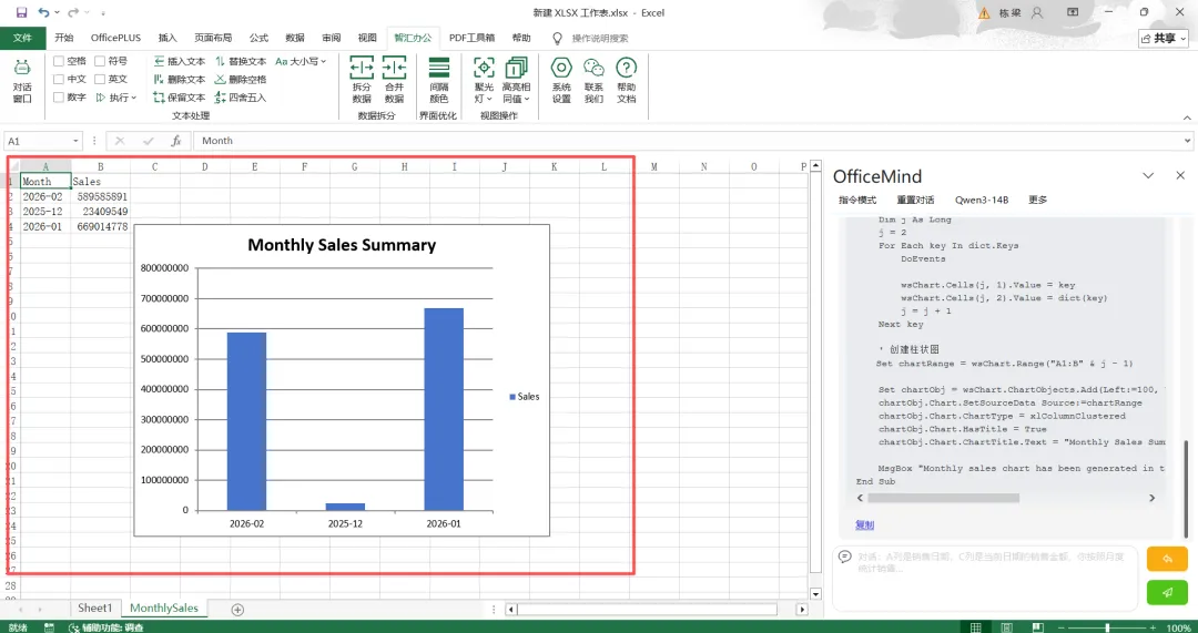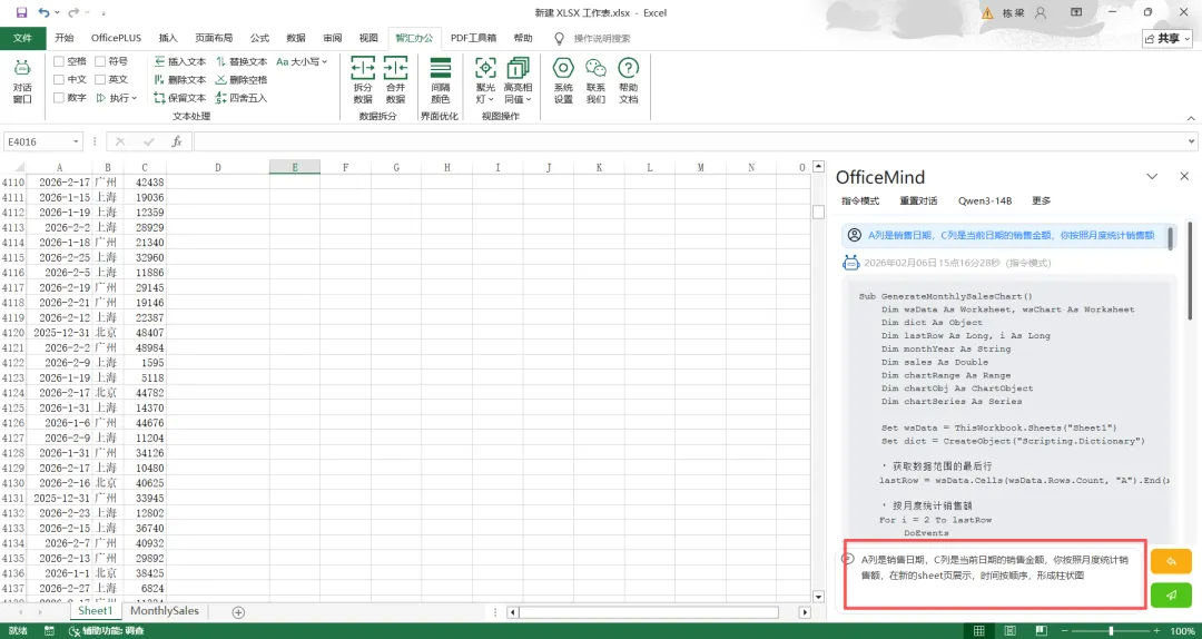 选中清洗完成后的演示数据(几十万行数据同样选中全部区域),打开OfficeMind插件,输入:“A列是销售日期,C列是当前日期的销售金额,你按照月度统计销售额,在新的sheet页展示,时间按顺序,形成柱状图”。