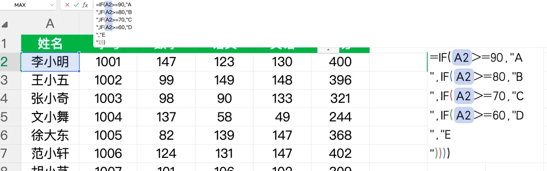 适用场景:适合等级档位少、想清晰看到判断逻辑的情况,方便老师根据自己班级的评分标准调整分数阈值。