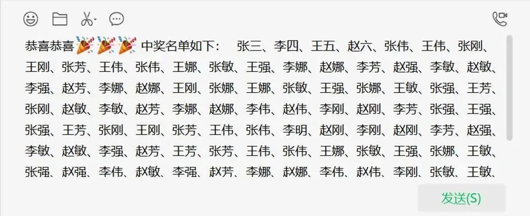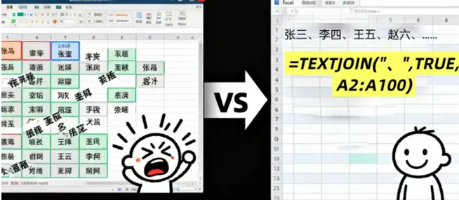 好了,说回正事。每年此时,行政或抽奖的同事都会面临一个甜蜜的烦恼:几十上百个中奖名字,散落在Excel不同格子里,怎么快速合并成一条,发群里公告?