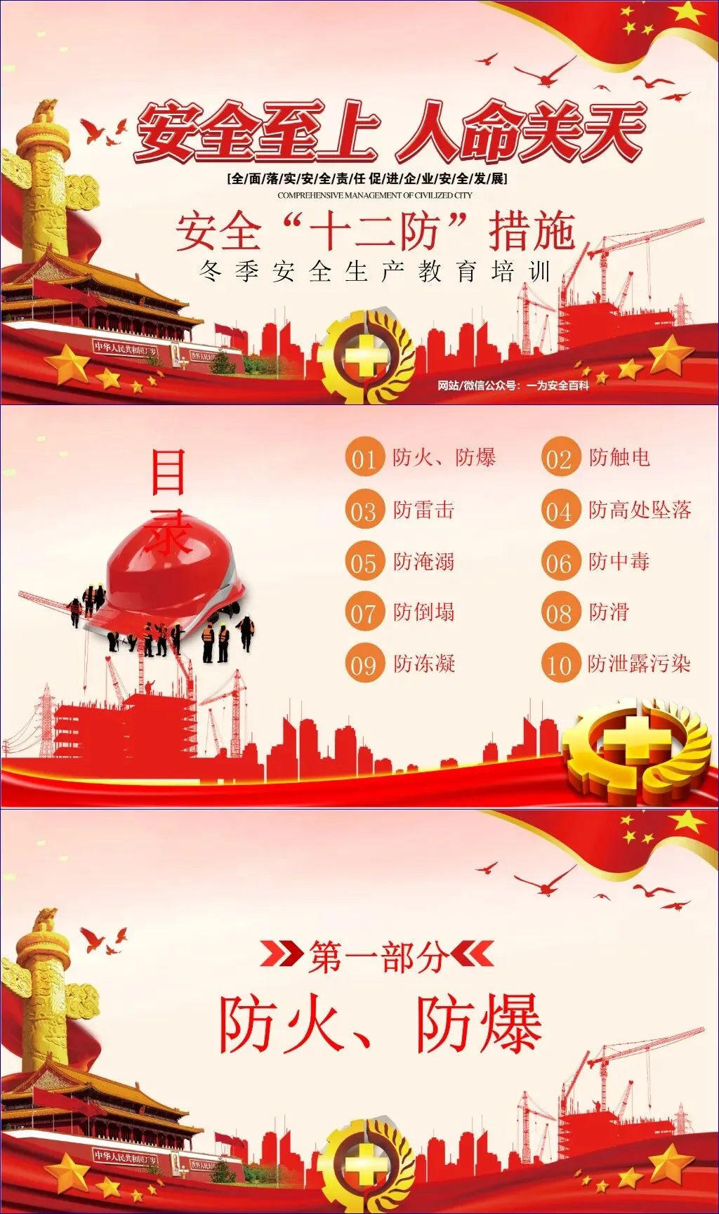 该文档是《2026冬季安全“十二防”措施教育培训》PPT,旨在加强冬季安全生产管理,防范各类安全事故。全文围绕“十二防”展开,具体包括以下方面: