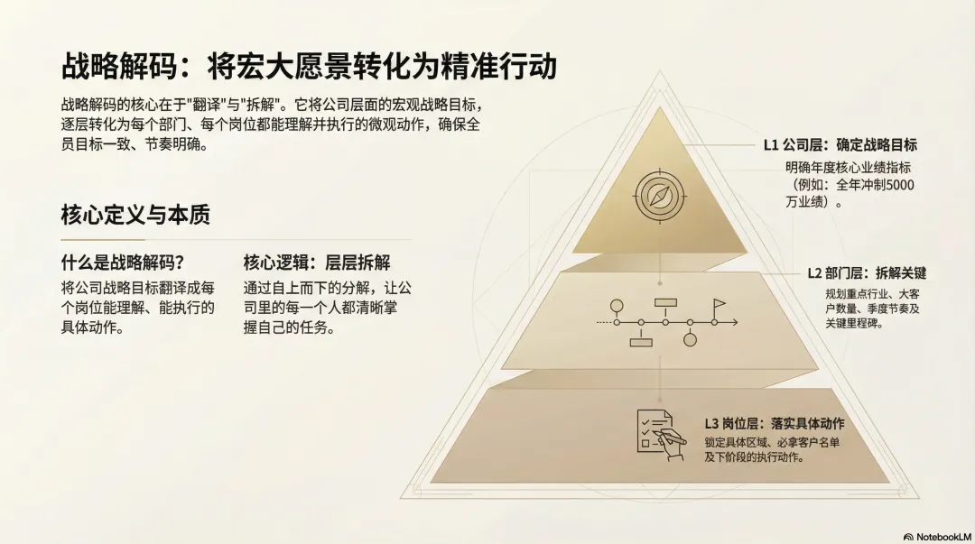 什么叫战略解码?就是把公司层面的战略目标,翻译成每个部门、每个岗位能理解、能执行的具体动作。
