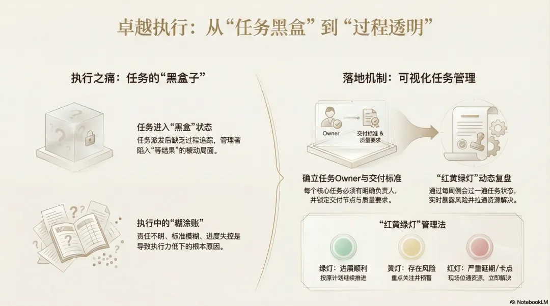 谁负责?什么时候交付?交付标准是什么?当前进度到哪了?遇到什么问题了?这些信息如果不透明,执行就是一笔糊涂账。