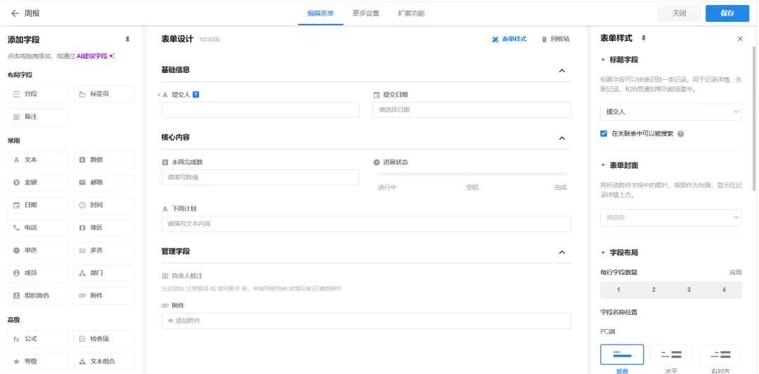 在平台上创建一张“团队周报”表,需要把核心字段规划好,比如: