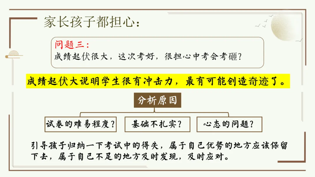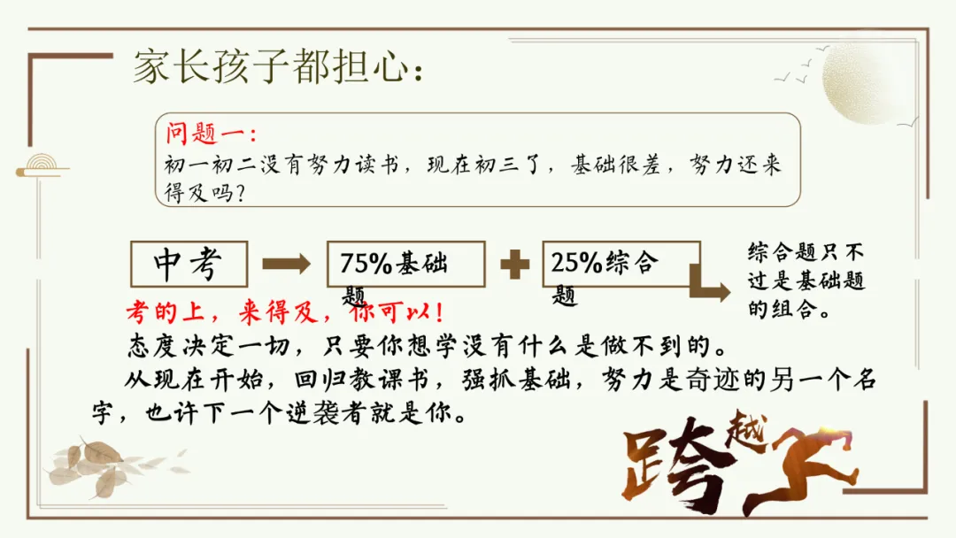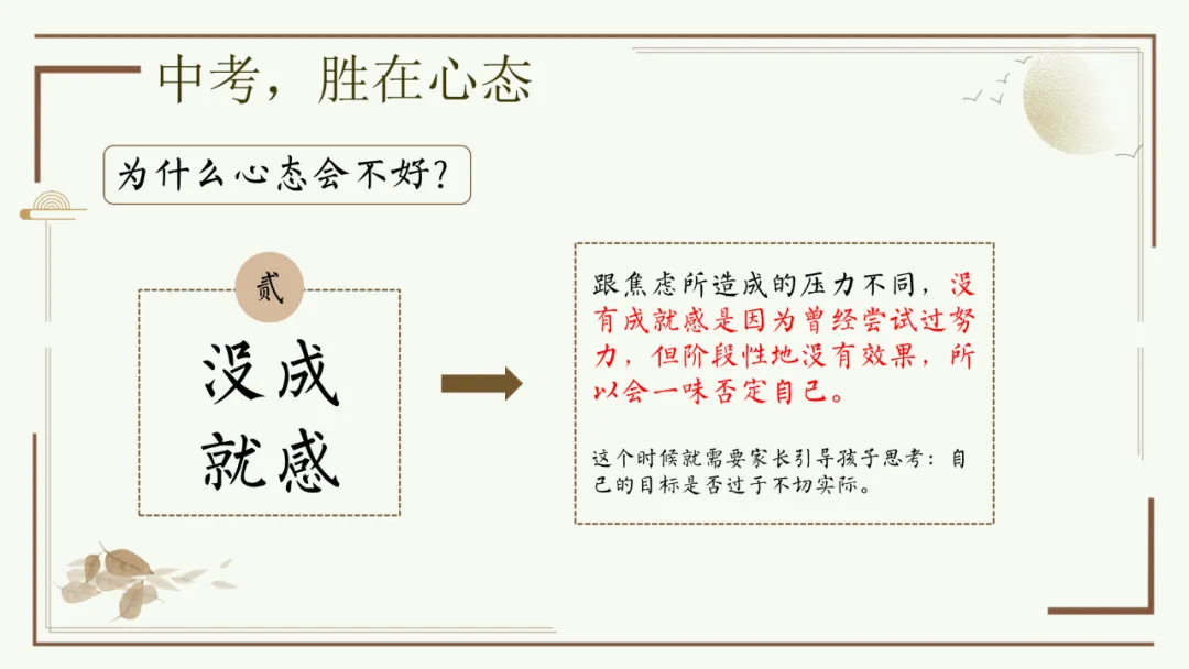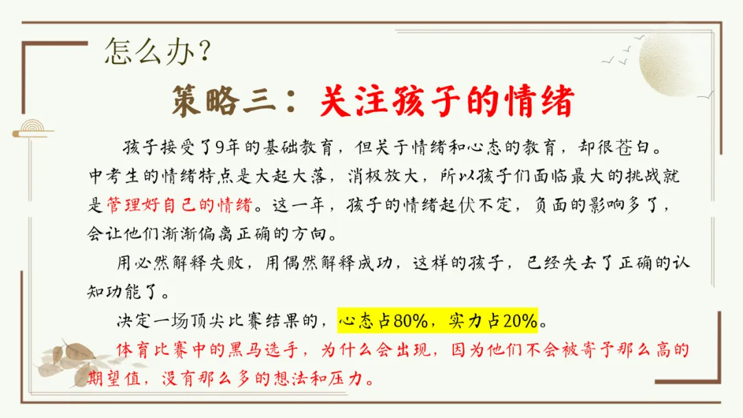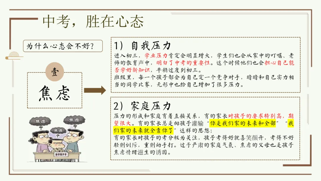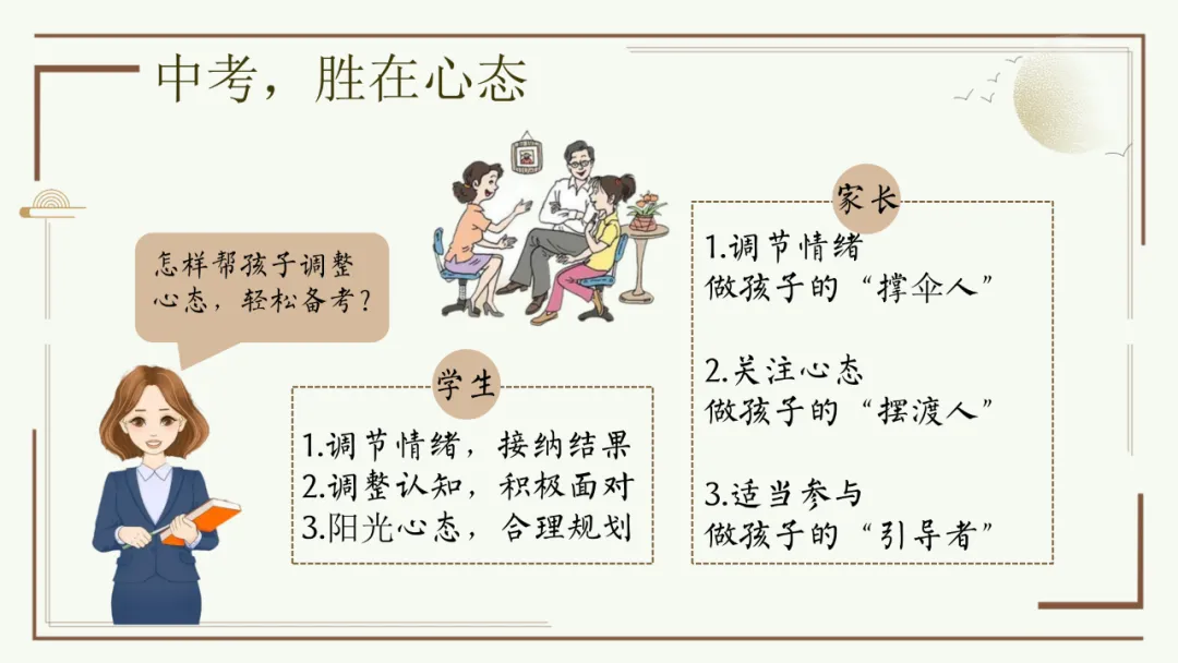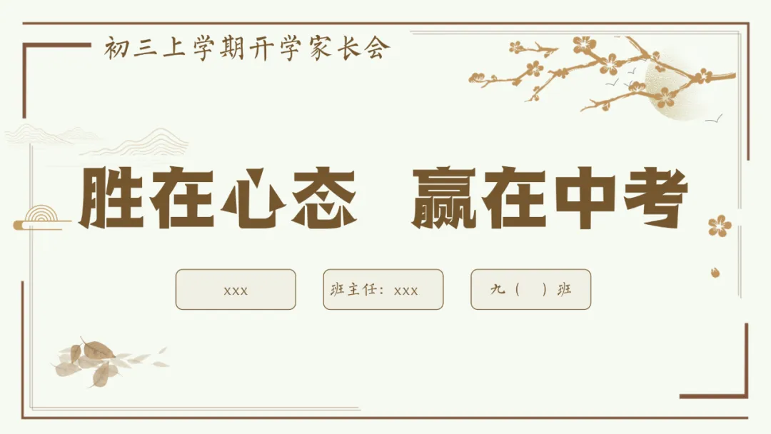 今天给大家分享优秀班主任开家长会的课件,主题是《胜在心态 赢在中考》。加入自己的一点小创意,仿佛给家长注入了新的血液,开得很成功。