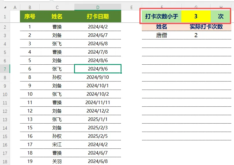 目标2:同步统计这些人员的具体出现次数,无需手动逐个计算