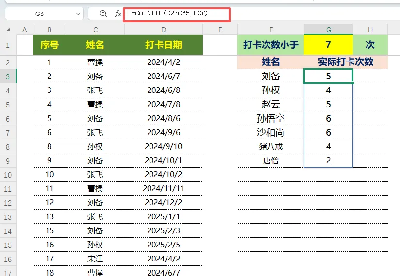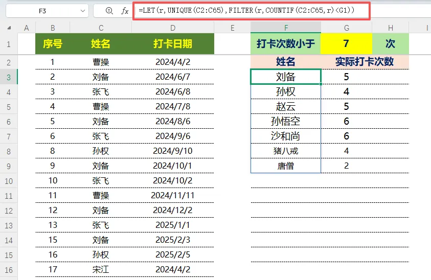 G1单元格:存储「指定次数」(比如要筛选出现次数<5次的人员,就在G1输入5)