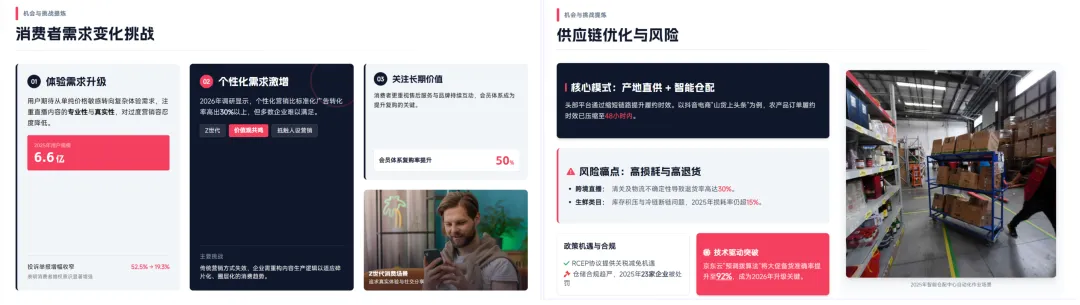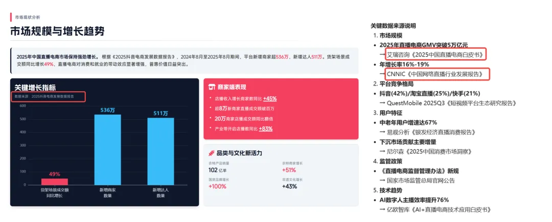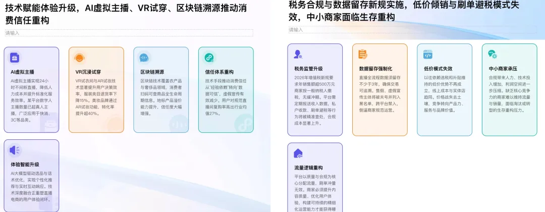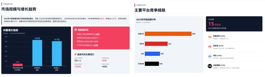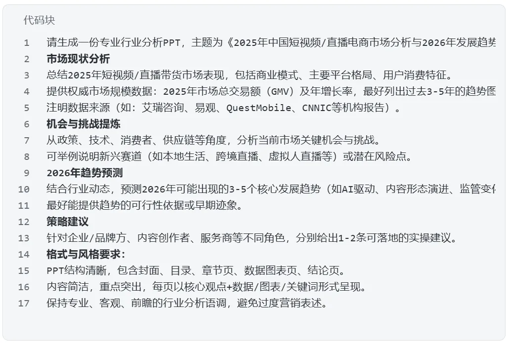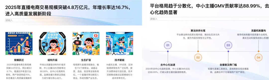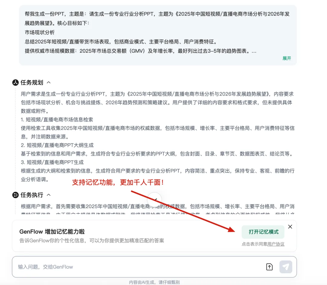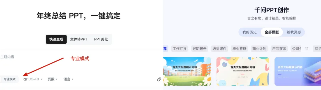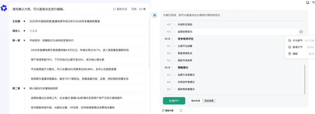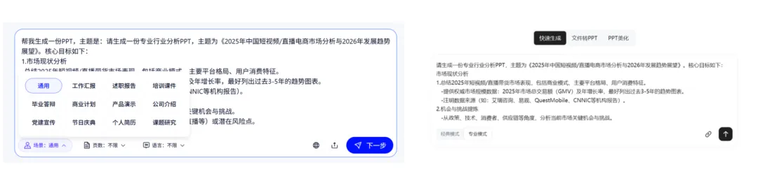 不是突然变努力了,是事情真的一起砸过来:年终总结、述职汇报、教学备课、经营分析。为了彻底解决写PPT这个难题,今天就把目前国内热门的两款大厂 AI PPT 工具测试了一下。一个是经营十几年的老牌文档平台,另外一个是 阿里系众多功能聚合入口。 | 在年终总结这种高压、内容密集、不能翻车的场景下,谁更扛得住除了AI智能体以外,我另外的业务方向是短视频电商,日常会有非常多的分析研究场景,这里用的核心提示词如下,我会分别在千问、百度文库中生成:恰好,文库PPT新增了通用智能体的专业模式,更有必要测试一下。最新的地址:https://wenku.baidu.com/打开入口界面,可以看到,在使用页面上,千问目前支持传统模版生成,文库可以选择经典或专业模式生成,两个平台风格和模版都很丰富。为了更好的对比和体验,我用相同的提示词,分别用千问和百度专业模式、经典模式生成了同样主题的PPT!两个产品的经典模式都会先生成 PPT 大纲,也都支持修改。差异点在于: 文库这边多了一个布局风格的切换选项 ,对后续观感影响不小。文库的专业模式是基于GenFlow通用智能,可以打开记忆模式,据说生成的PPT会更加千人千面,的确被拉到了下一个级别!有一点比较特殊,专业模式的历史文档需要打开 GenFlow,在对话历史里找到,而且在记忆中心可以查看已经保存的历史记忆。最终版本PPT的生成,文库和千问都很快给出结果。只用了三分钟不到。第一眼看,两款PPT工具的最终结果给人的感觉都不错:但细心的朋友应该注意到了,千问生成的PPT排版有些重复,许多页面都是套用的同一套排版形式↓这其实并不是个例,市面上绝大多数的AI PPT产品其实都有这个通病,主要还是因为内置的模板有限。