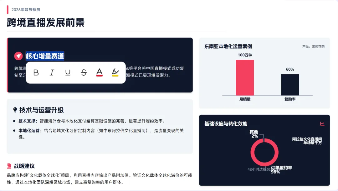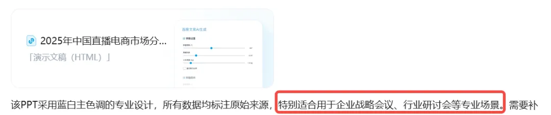 也是在这一轮对比里,文库新版PPT开始显出不一样的地方 。而且这些图表都带数据源, 有据可依, 对年终总结来说,这点很关键:我应用了几个场景,不管是经典模式还是专业模式,生成结果都在 25 页以上 :3️⃣ 内容更丰富、配图更丰富,从各维度进行专业分析、案例举证,真实感更强依托百度文库18亿专业文档,基于汇报目标,从更多维度寻找专业数据、典型案例,来支撑报告的完整性:AI PPT 这么卷,为什么测试下来,在 内容、结构和观感 这三件事上,反而是文库做得最稳?很多 AI PPT 看起来很专业,仔细一读,全是模板化表达,缺的是行业里的“真内容”。百度文库背后是十几亿份长期被真实用户反复使用过的专业文档,覆盖教育、医疗、工程、运营等大量场景。当我写到针对品牌方的具体运营优化策略时,生成结果明显更贴近真实汇报,不太需要来回返工。文库PPT的专业模式会更加千人千面,专业性和美观性都明显更优,模板、风格等基本不需要再手动调整:百度文库的 PPT 编辑逻辑,基本贴合大家原本的工作流程,上手成本低,用起来也更安心。AI PPT之间的差距,平时其实不太明显。 真正拉开差别的,往往是年终总结这种时间紧、要求高、容错率极低 的场景。用AI做PPT,核心不在于一句话生成,而在于能不能少折腾、少出错、按时交付。各家都在卷 PPT,但真正决定一款工具靠不靠谱的,还是那些细节——至少在“把活完整干完”这件事上,百度文库更像一个可以放心交付的 AI PPT 工具。