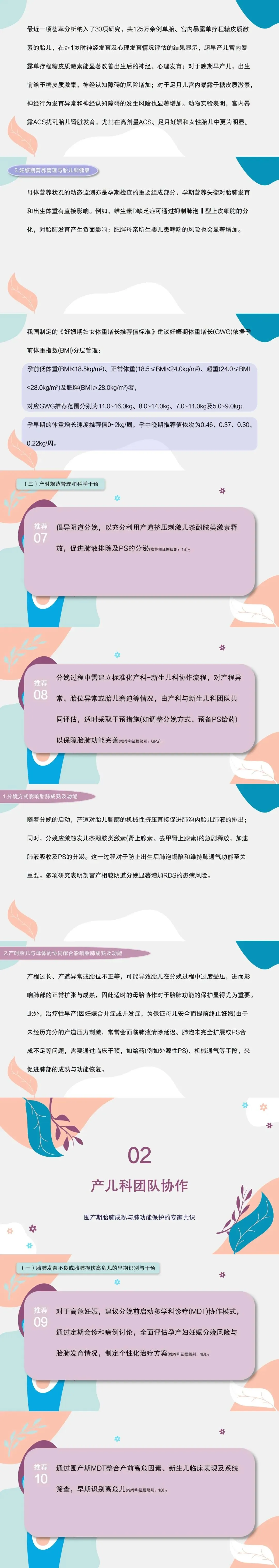 9.对于高危妊娠,建议分娩前启动多学科诊疗(MDT)协作模式,通过定期会诊和病例讨论,全面评估孕产妇妊娠分娩风险与胎肺发育情况,制定个性化治疗方案。