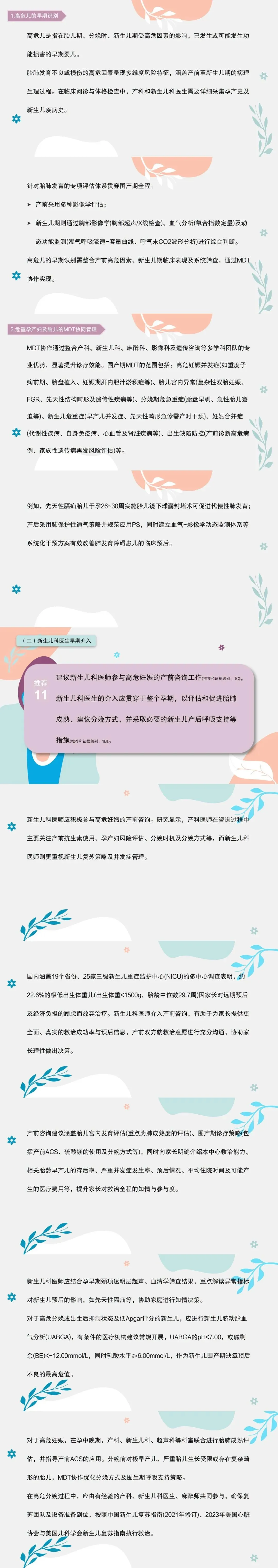 11.建议新生儿科医师参与高危妊娠的产前咨询工作,新生儿科医生的介入应贯穿于整个孕期,以评估和促进胎肺成熟、建议分娩方式,并采取必要的新生儿产后呼吸支持等措施。