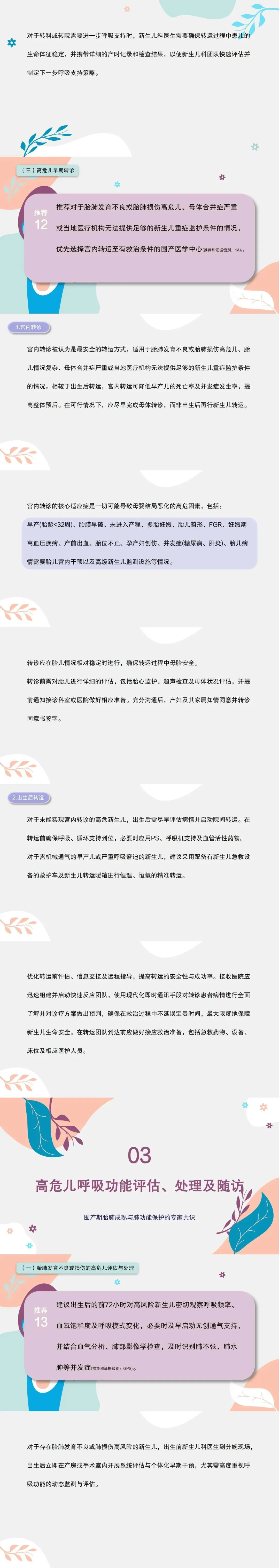 12.推荐对于胎肺发育不良或胎肺损伤高危儿、母体合并症严重或当地医疗机构无法提供足够的新生儿重症监护条件的情况,优先选择宫内转运至有救治条件的围产医学中心。