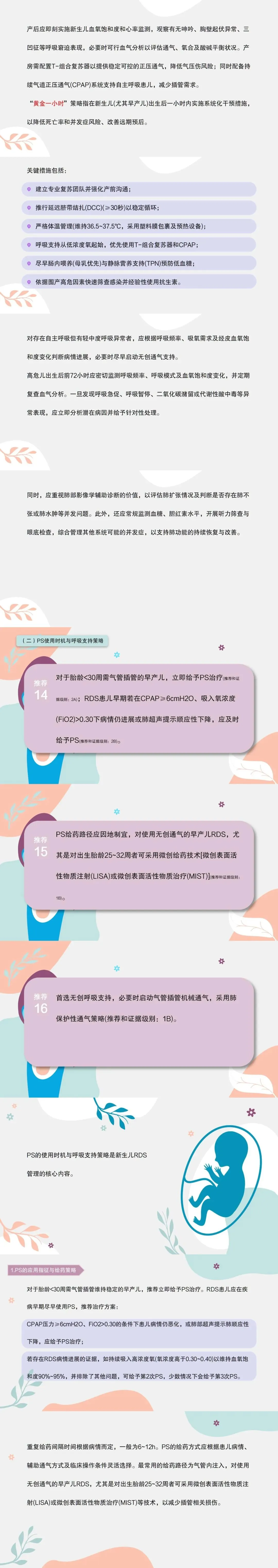 13.建议出生后的前72小时对高风险新生儿密切观察呼吸频率、血氧饱和度及呼吸模式变化,必要时及早启动无创通气支持,并结合血气分析、肺部影像学检查,及时识别肺不张、肺水肿等并发症。