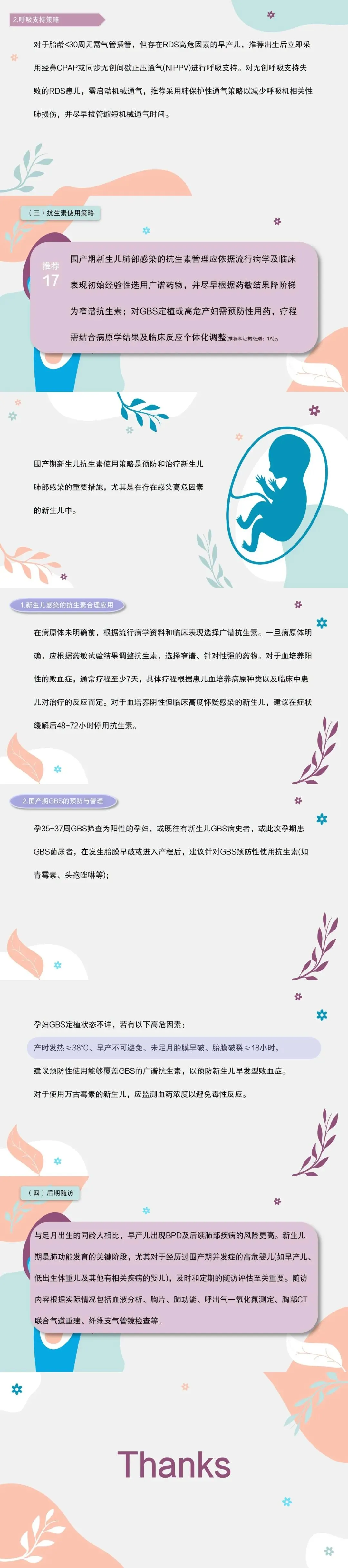 17.围产期新生儿肺部感染的抗生素管理应依据流行病学及临床表现初始经验性选用广谱药物,并尽早根据药敏结果降阶梯为窄谱抗生素;对GBS定植或高危产妇需预防性用药,疗程需结合病原学结果及临床反应个体化调整。