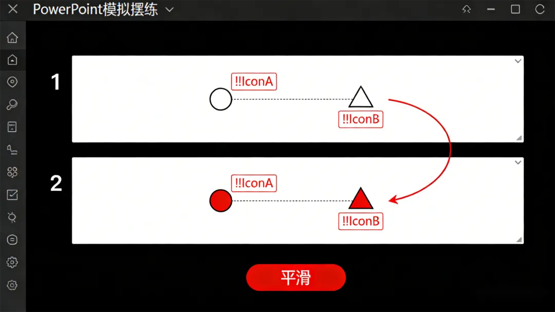 平滑切换功能可以识别图片和3D模型的位置、大小和旋转角度的变化,从而实现平滑过渡。通过调整图片的大小和位置,我们可以实现镜头推进或拉远的效果;通过调整3D模型的旋转角度,我们可以展示3D模型的不同角度。这个技巧非常适合用于产品展示、旅游介绍或者建筑设计的演示。比如你可以用图片缩放展示产品的细节,或者用3D模型旋转展示建筑的不同角度。当需要多个元素同步参与平滑过渡时,我们可以通过为每个对象命名相同的“!!”前缀,实现多对象协同的复杂动画效果。- 在幻灯片1中插入两个独立形状:一个圆形命名为!!IconA,一个三角形命名为!!IconB