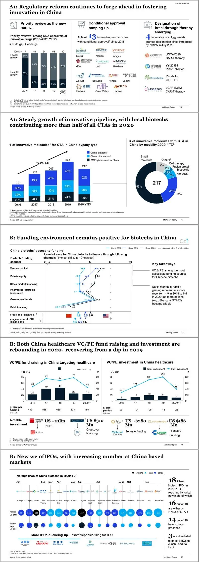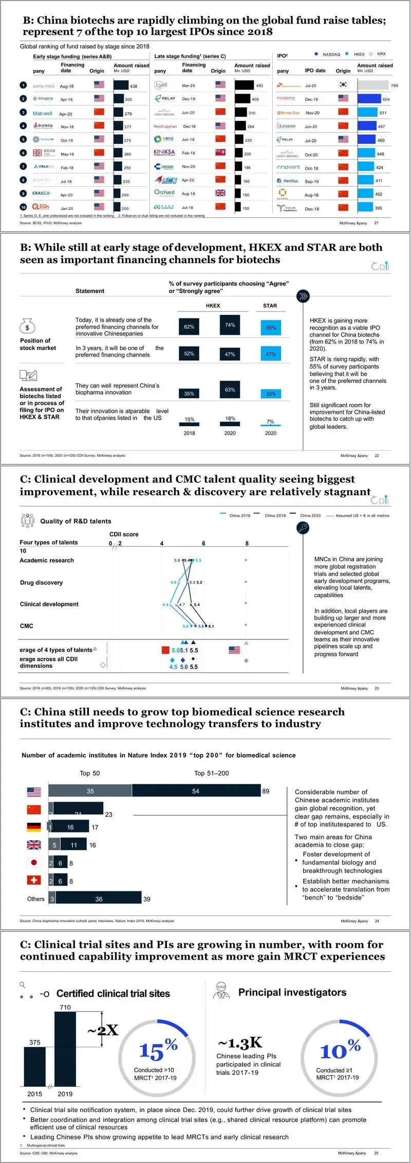 资本层面,中国生物科技公司的融资环境保持强劲。风险投资和私募股权市场在2020年出现反弹,香港交易所和上海证券交易所科创板的上市渠道为生物科技公司提供了重要的融资平台,使得中国生物科技公司在全球融资排行榜上迅速攀升。这为本土创新注入了强劲动力。