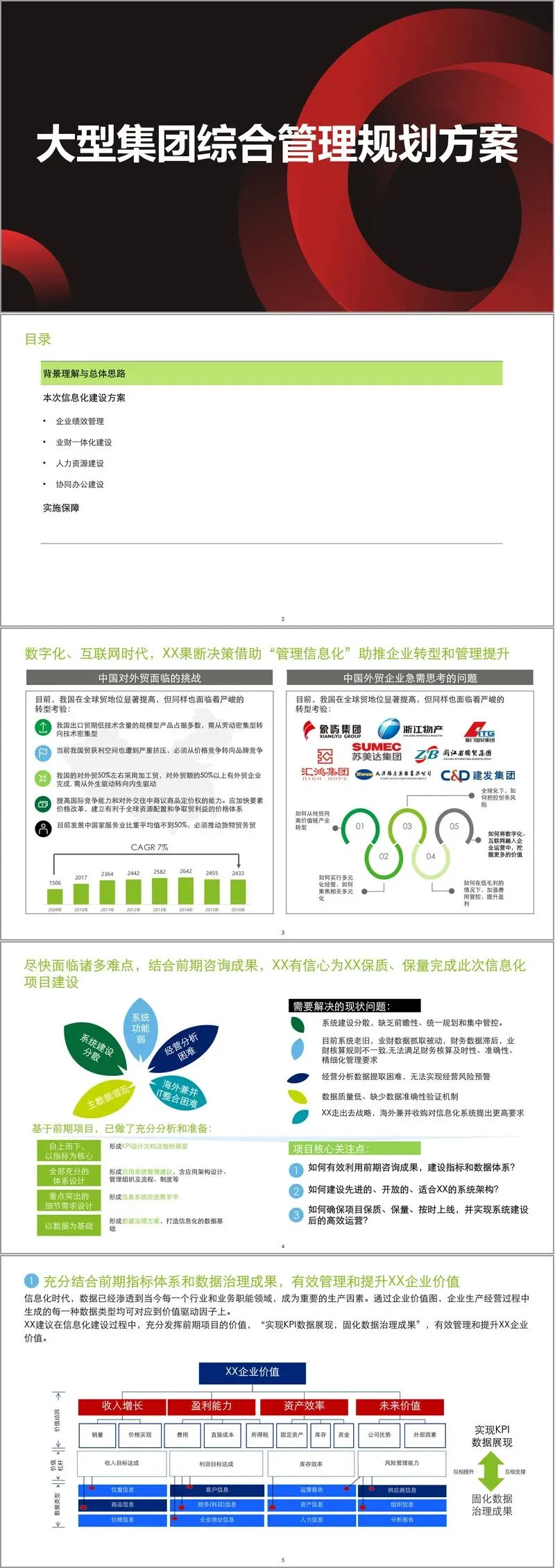 这份大型集团综合管理规划方案,深刻剖析了在数字化与互联网时代背景下,一家大型企业集团(以下简称“该集团”)如何借助管理信息化实现战略性转型与管理提升。方案开篇即点明中国外贸企业当前面临的严峻挑战:尽管全球贸易地位显著提升,但发展模式亟待从劳动密集型转向技术密集型,从价格竞争转向品牌竞争,从外生驱动转向内生驱动。在此背景下,该集团的信息化水平已落后于行业发展,并对业务拓展构成了制约。