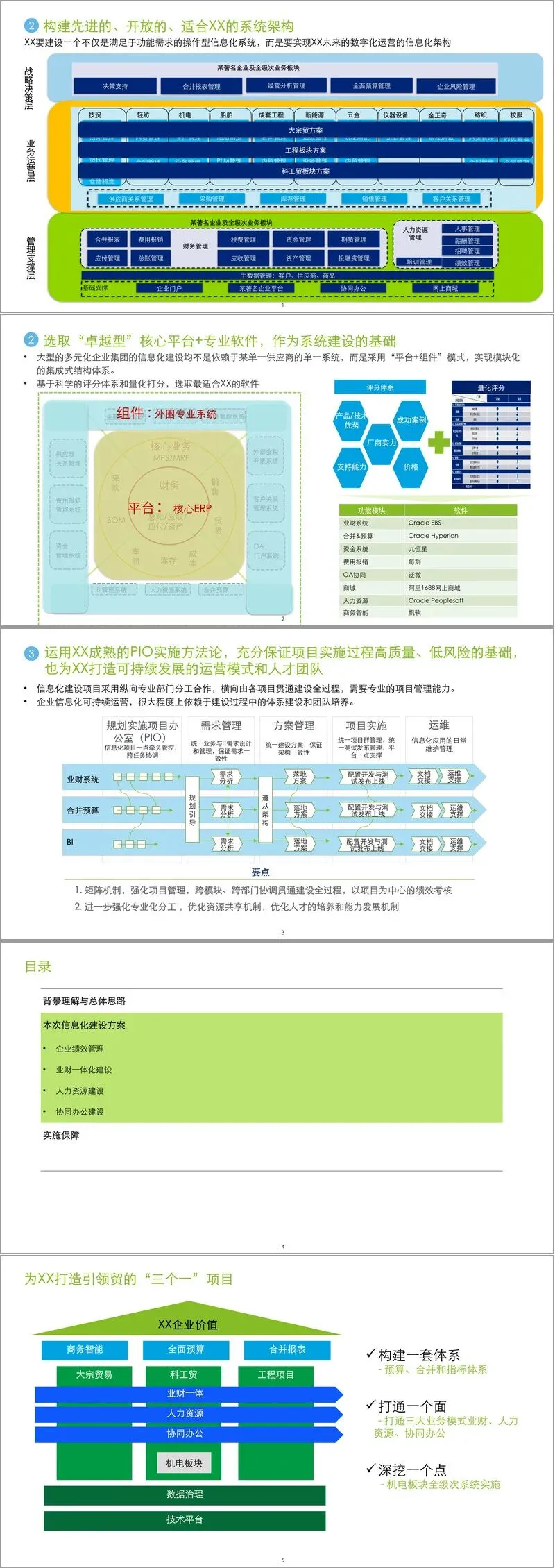 面对这些挑战,方案提出了以价值为导向的综合性解决路径。其核心是构建“三个一”工程:即构建一套贯穿预算、合并报表和关键绩效指标(KPI)的指标体系;打通一个涵盖大宗贸易、科工贸协同、工程项目、业财一体、人力资源及协同办公的业务面;并选择机电板块作为试点,进行全级次的系统深度实施。这旨在将前期管理咨询中形成的KPI设计、应用架构蓝图及数据治理方案等成果有效落地。