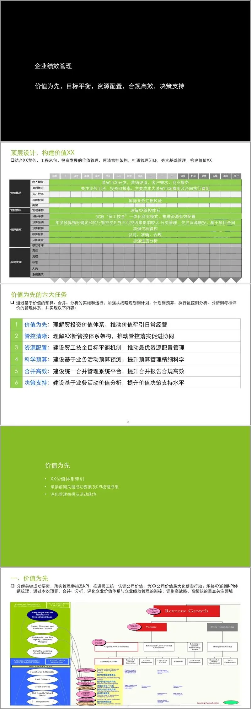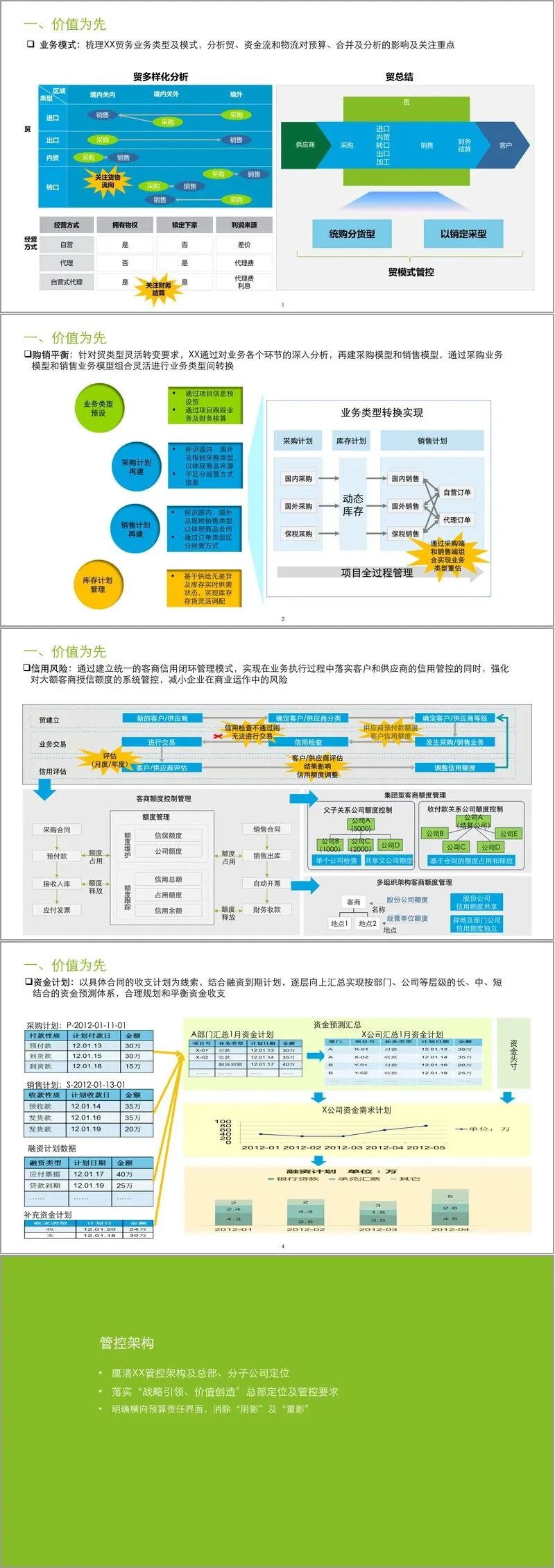 第一,价值为先。方案提出分解关键成功要素,将KPI体系与企业价值图(涵盖收入增长、盈利能力、资产效率、未来价值)紧密衔接。具体措施包括梳理多样化的贸易业务模式(如自营、代理、转口等)、重建灵活的购销平衡模型、建立贯穿业务全过程的客商信用闭环管理体系,以及构建从合同收支出发的多层级资金预测体系。