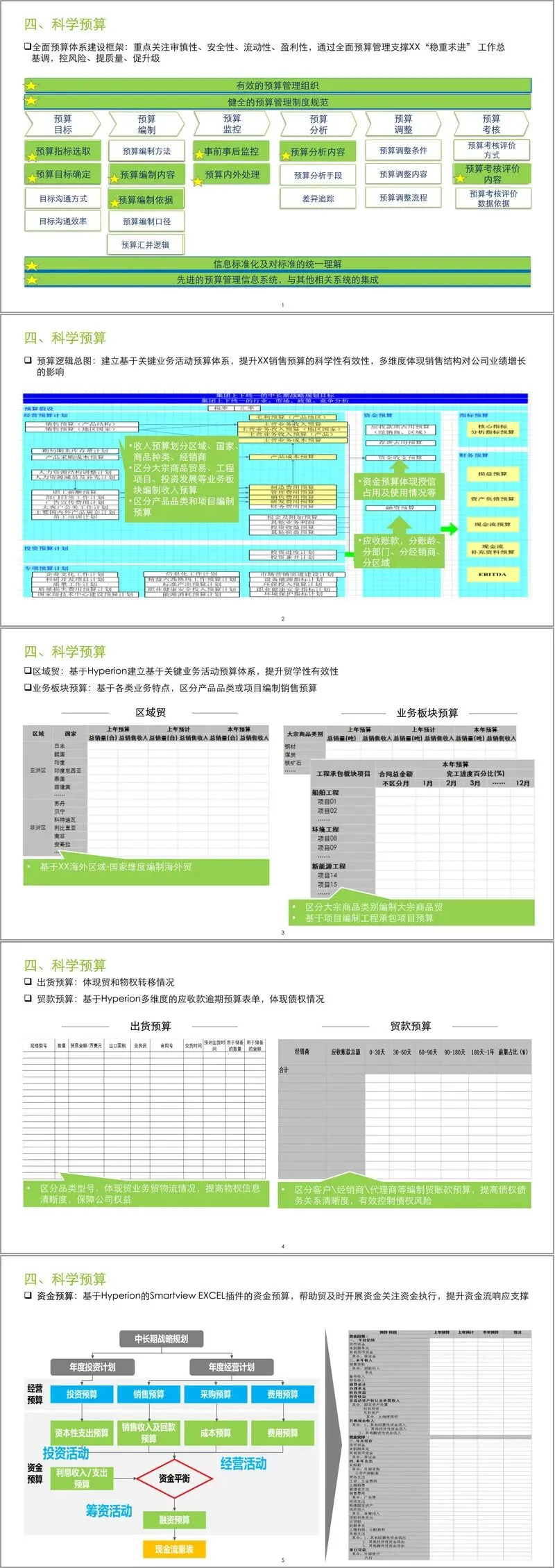 第四,科学预算。致力于建设全面的预算管理体系,其框架包含有效的组织、健全的制度以及从目标、编制、监控、分析、调整到考核的全过程。方案特别展示了基于关键业务活动的预算逻辑总图,涵盖区域贸易、业务板块、出货、货款及资金等多个维度的预算。